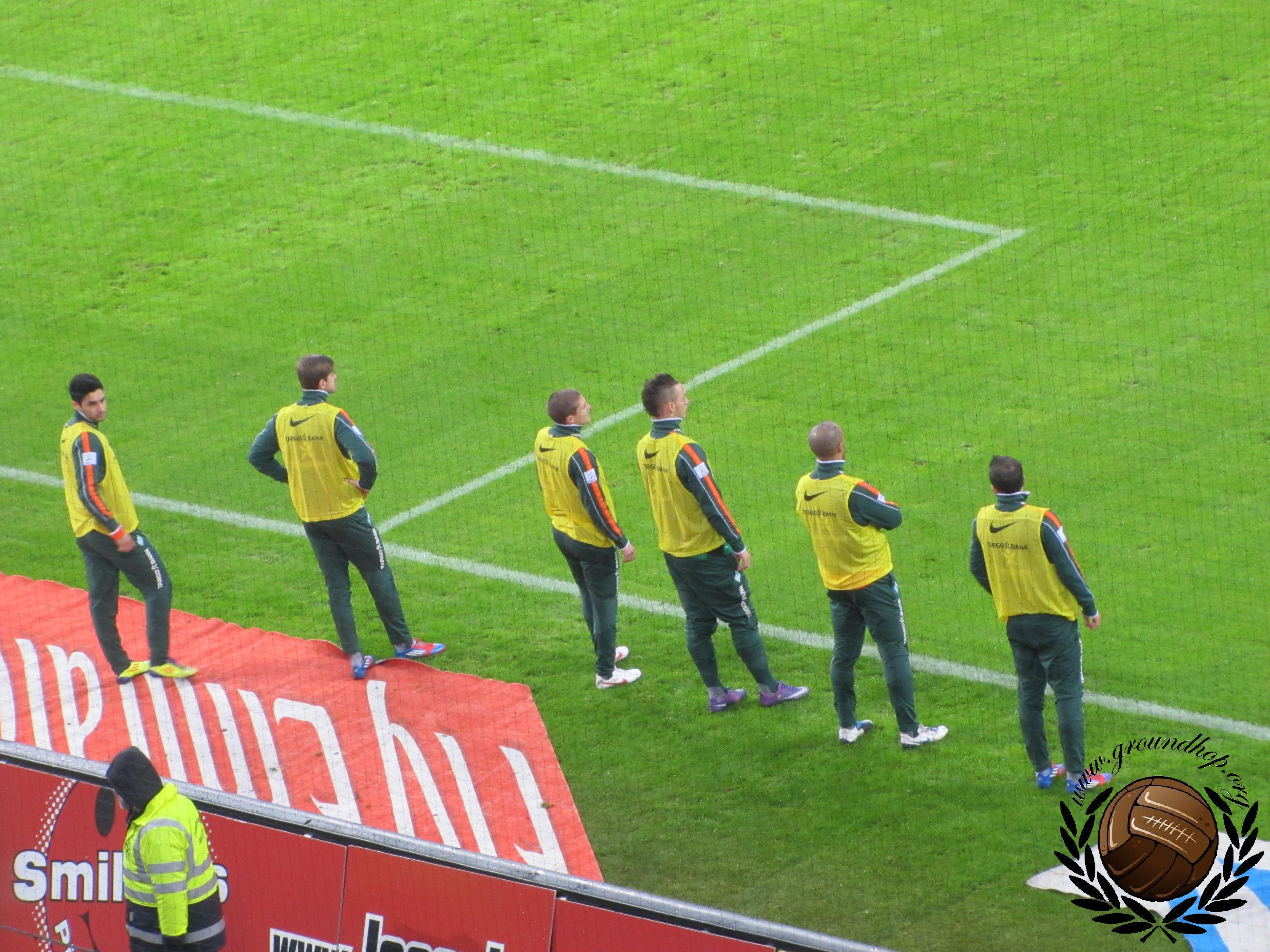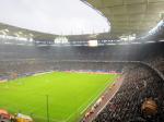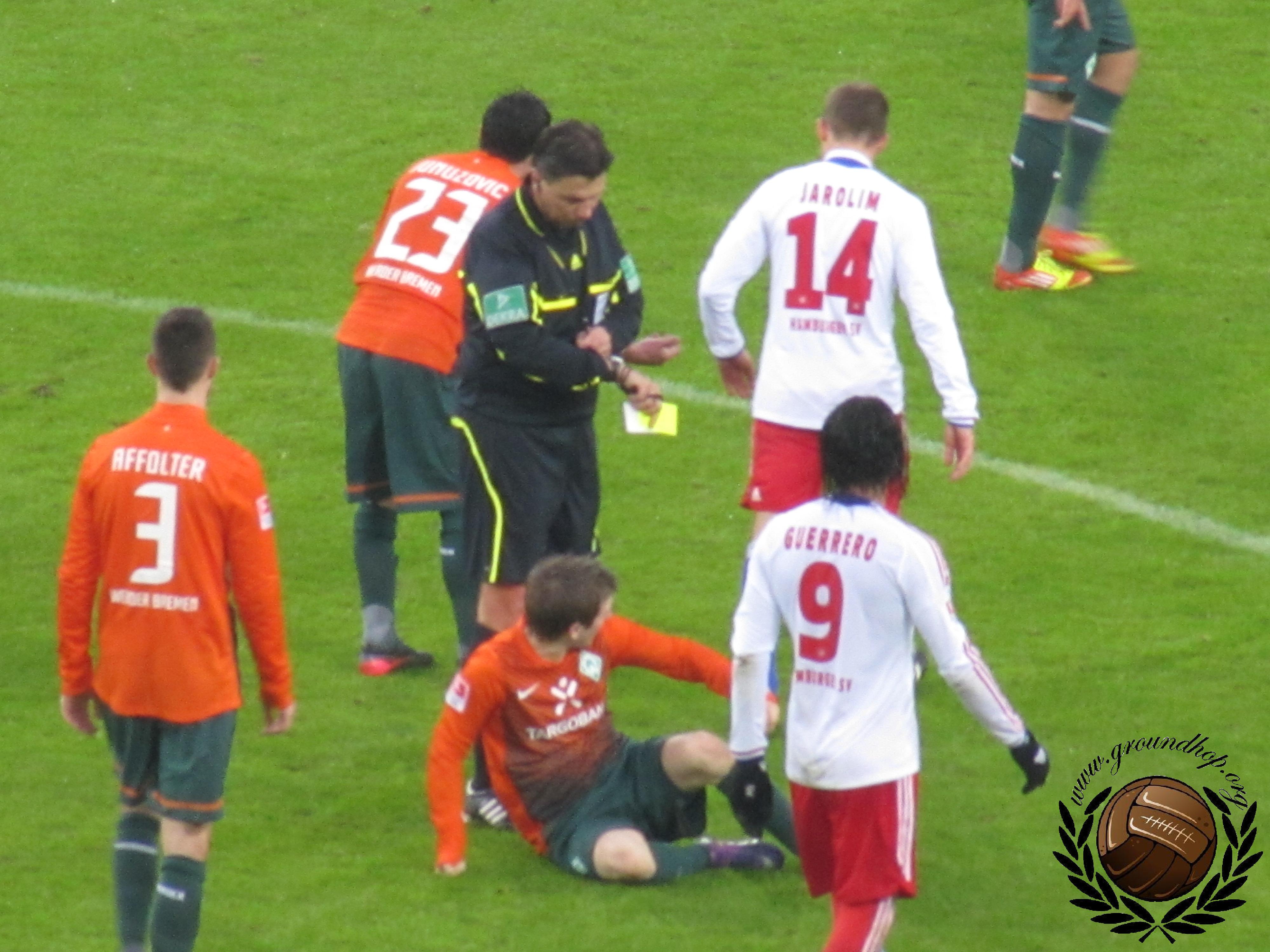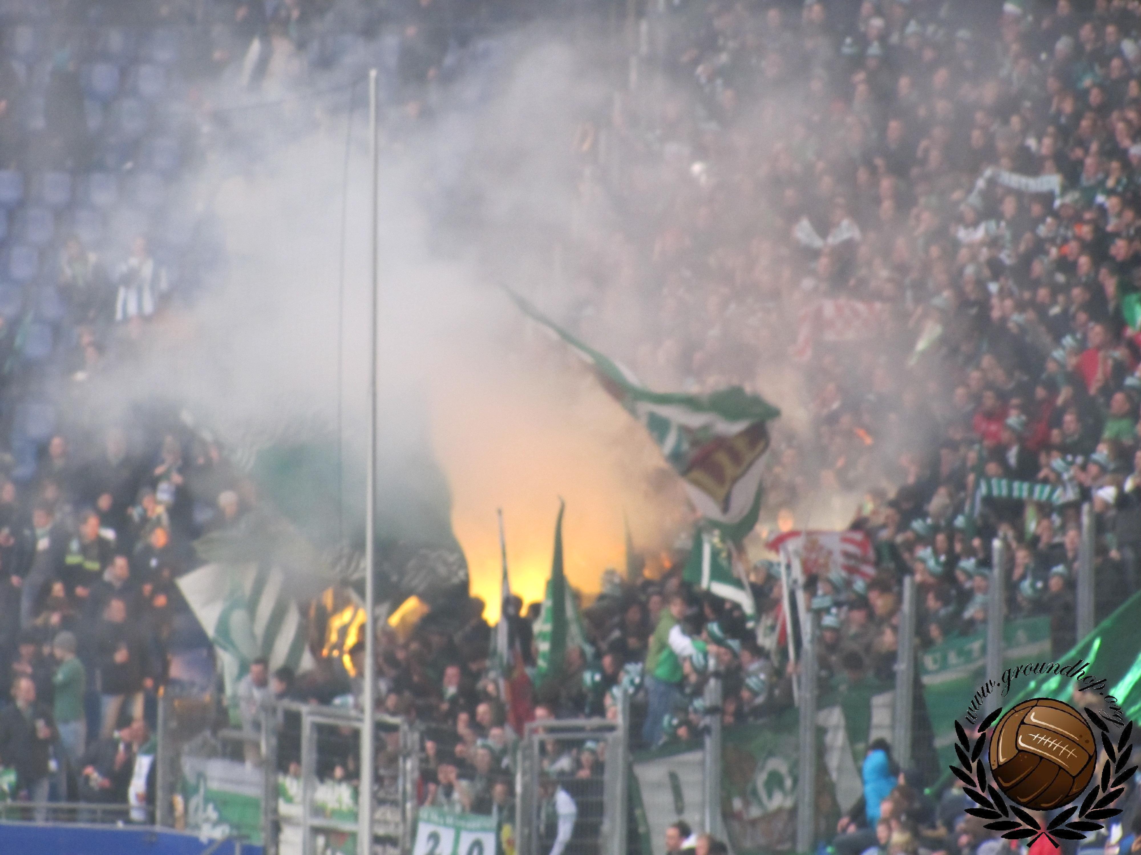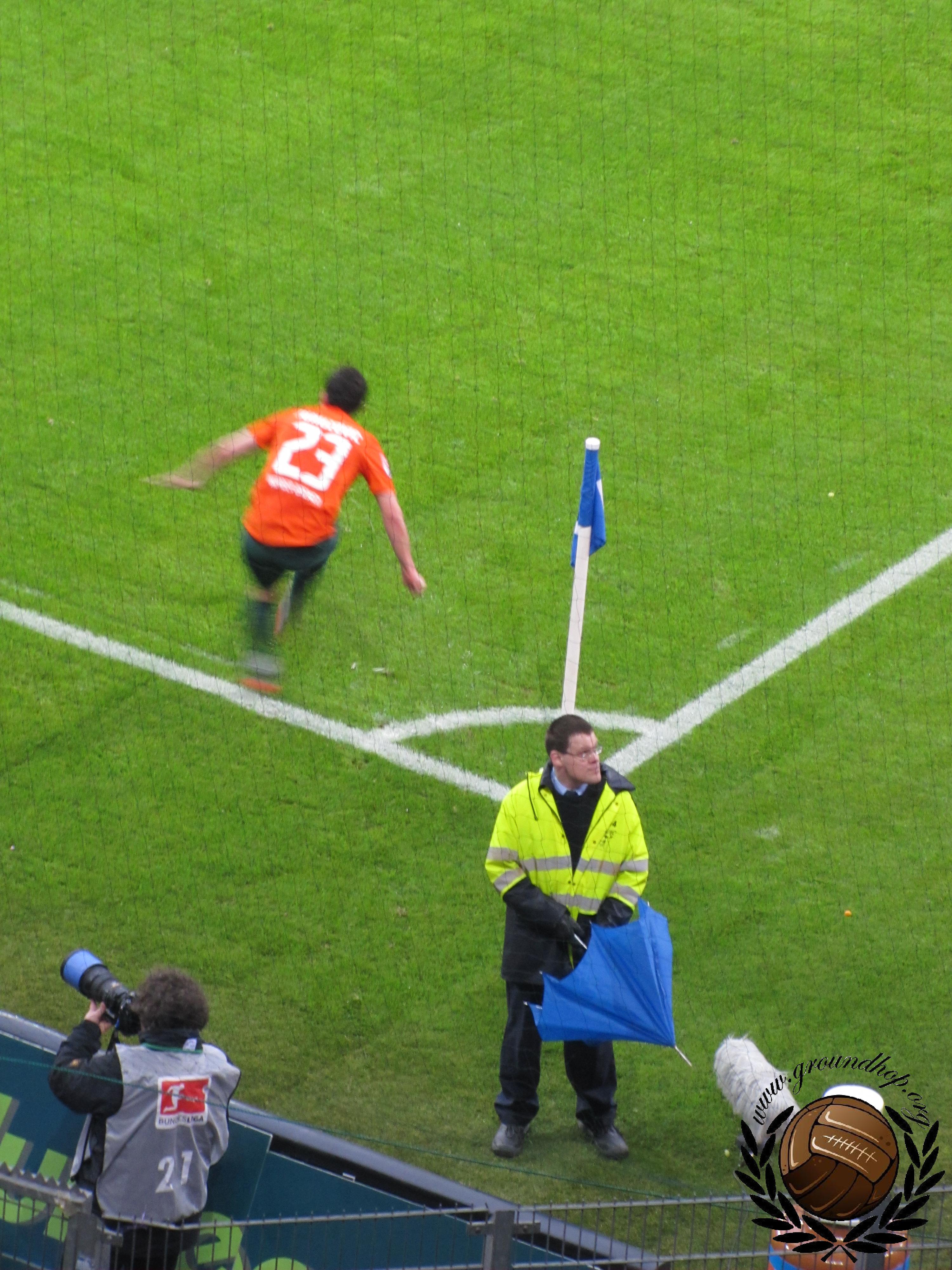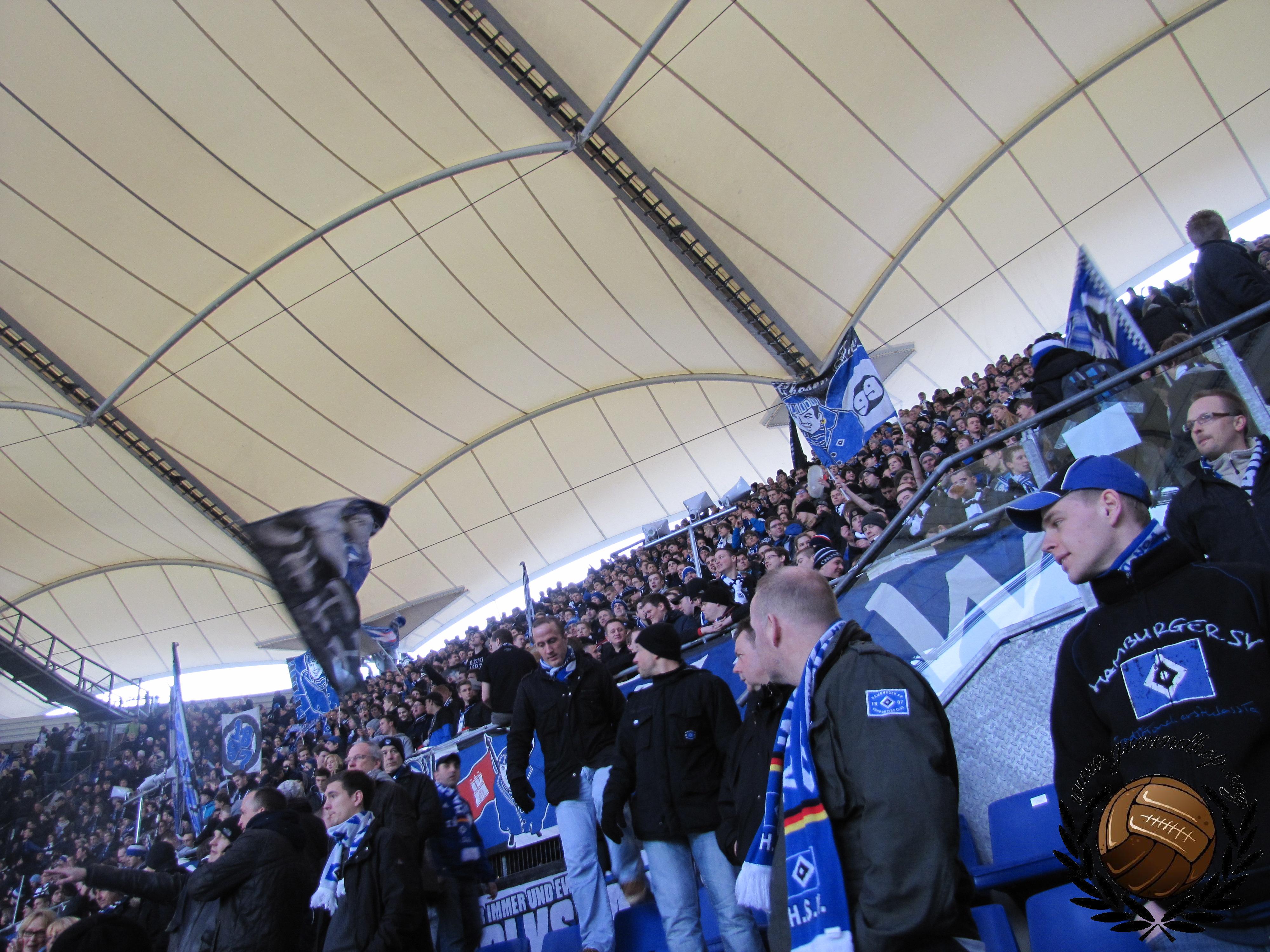 Wat opvalt zijn de vele zwervers rondom het stadion die winkelwagentjes uitstallen waarin lege bierflesjes worden gelegd. Een uur van te voren komen we aan op onze plekken. Recht onder “The Chosen Few”, de ultragroep van HSV. Het sfeertje zat er goed in, maar na de 1-3 viel zelfs de capo stil. Duidelijk is dat in Duitsland alles wat er qua sponsoring binnen te halen valt, binnen wordt gehaald. Alles is gesponsord, van de bal tot de corners, van de doelpunten tot de gele kaarten..