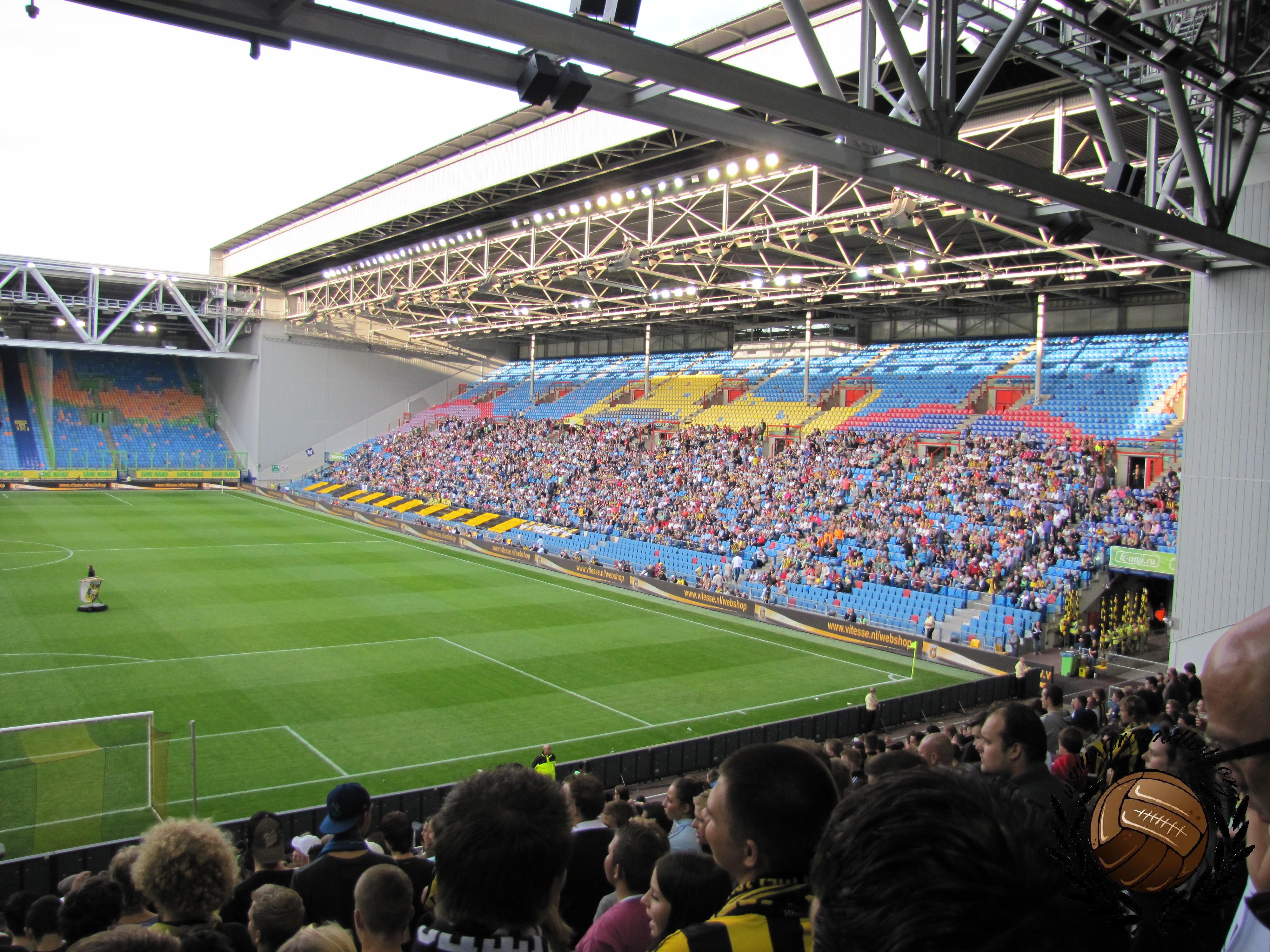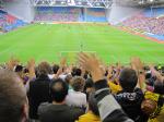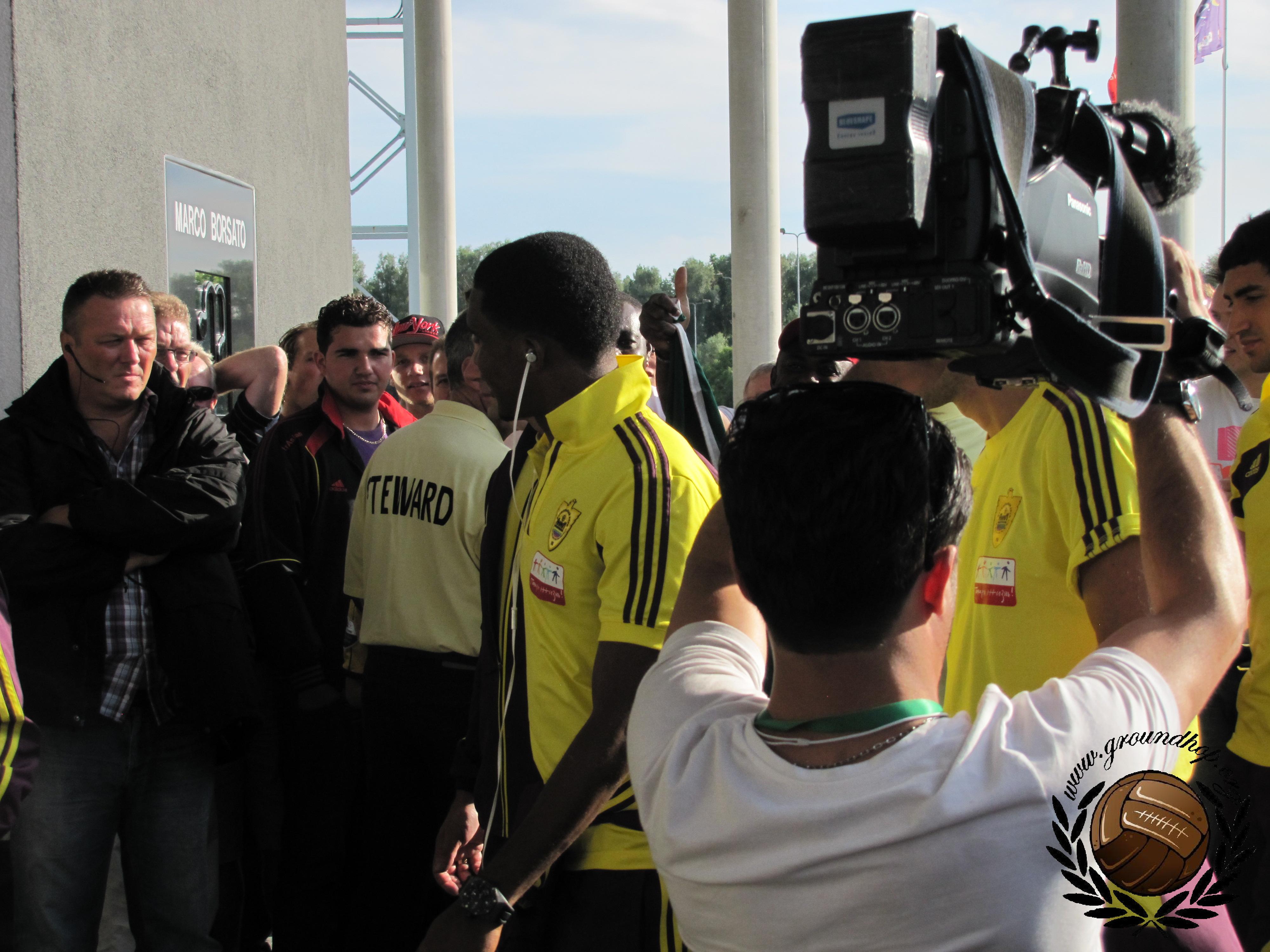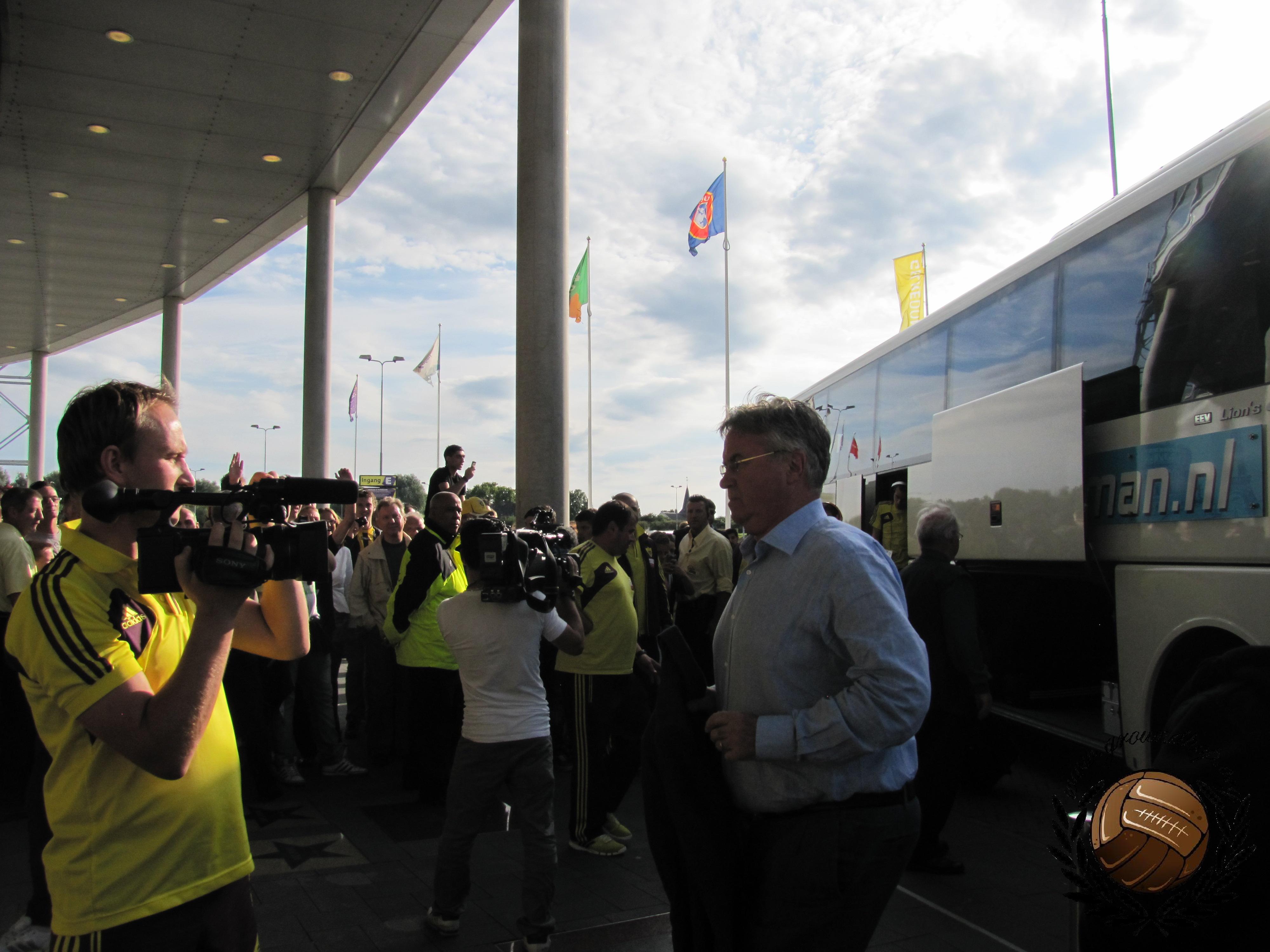 Wij reizen af naar Arnhem, zoals gewoonlijk met de trein. Na een mooie zonnige dag op het terras reizen we met de gratis pendelbus naar het stadion. Aangekomen bij het Gelredome bleken veel supporters zich rond de hoofdingang te hebben verzameld. Ook Ben van het programma Voetbalfans was aanwezig. De spelersbussen kwamen aan en dat is dus de kans om wereldsterren als Roberto Carlos, Eto’o, Boussoufa en Zhirkov op de foto te krijgen, en niet te vergeten Guus Hiddink.