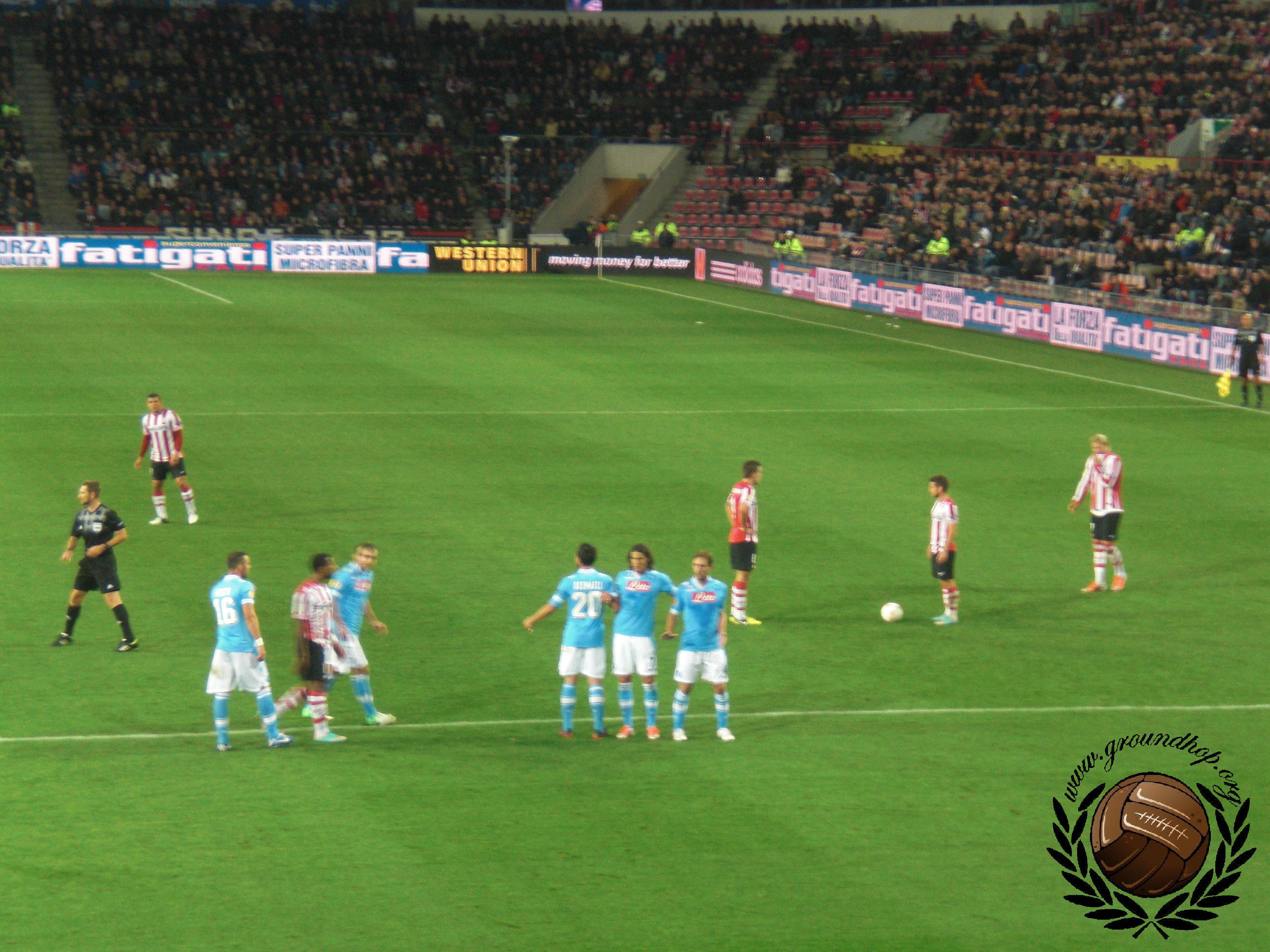 Napoli probeert tot een kwartier voor tijd nog in de buurt te komen van een treffer maar geeft het daarna op. De kopjes gaan hangen en in de laatste vijf minuten weet Napoli nog vijf gele kaarten te verzamelen wat het totaal op acht brengt. De supporters merken de irritatie op het veld en weten dat de wedstrijd gespeeld is. De supporters laten blijken verstand te hebben van het Italiaans en scanderen dan ook “Arrivederci jalalalala”. Is weer eens wat anders dan “houdoe en bedankt”.
