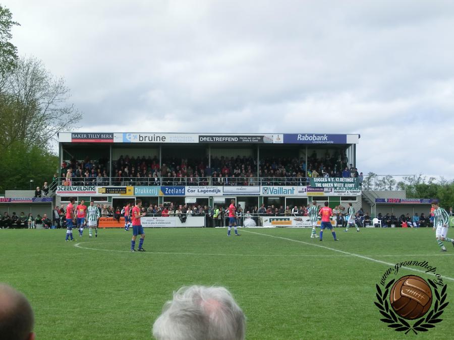 De fraaie hoofdtribune van VV Kloetinge.
