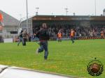 Supporters die tijdens de wedstrijd allervriendelijkst waren tegen ons, trekken hun capuchon op en sprinten het veld op. Sussen lukt niet helemaal dus escaleert het voor een tweede maal.