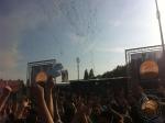 De supporters van de Westtribune komen op het veld. De vroege vogels worden afgevoerd richting een busje van de politie en zullen het feest niet meemaken.