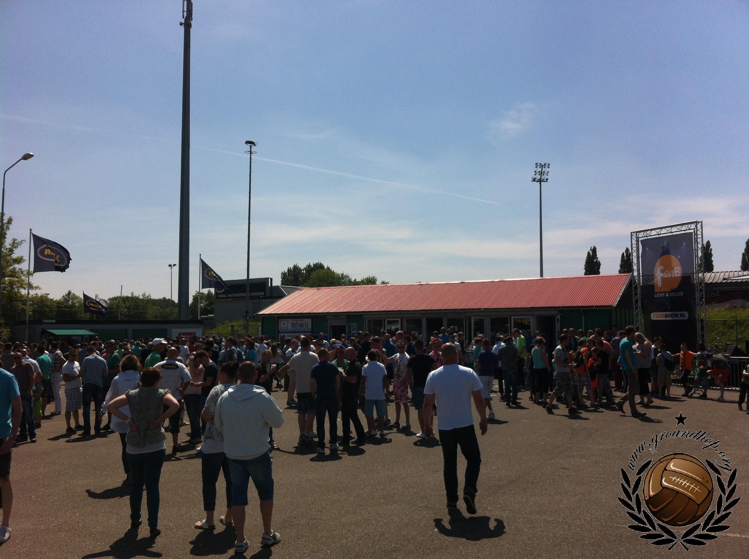 Het normaal vrij uitgestorven supportersplein van Dordt is nu gezellig druk.
