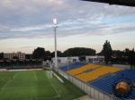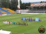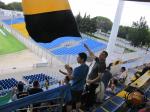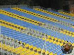 Aan de andere zijde van de tribune stonden de ultras van het voormalige Arles. Een aanzienlijk groter groepje. Toen wij dat groepje het “Aux armes” zagen zingen samen met de acht helden die vanuit Niort waren meegekomen besloten we daar maar eens te gaan kijken. Plek was er genoeg want in tegenstelling tot wat het stadion doet vermoeden, kwam er geen hond kijken. Alleen de hoofdtribune was geopend en in totaal zat er