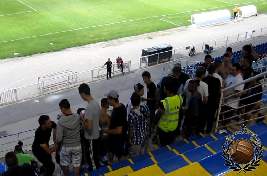 De begroeting tussen beide supportersgroepen. (zie ook de video)