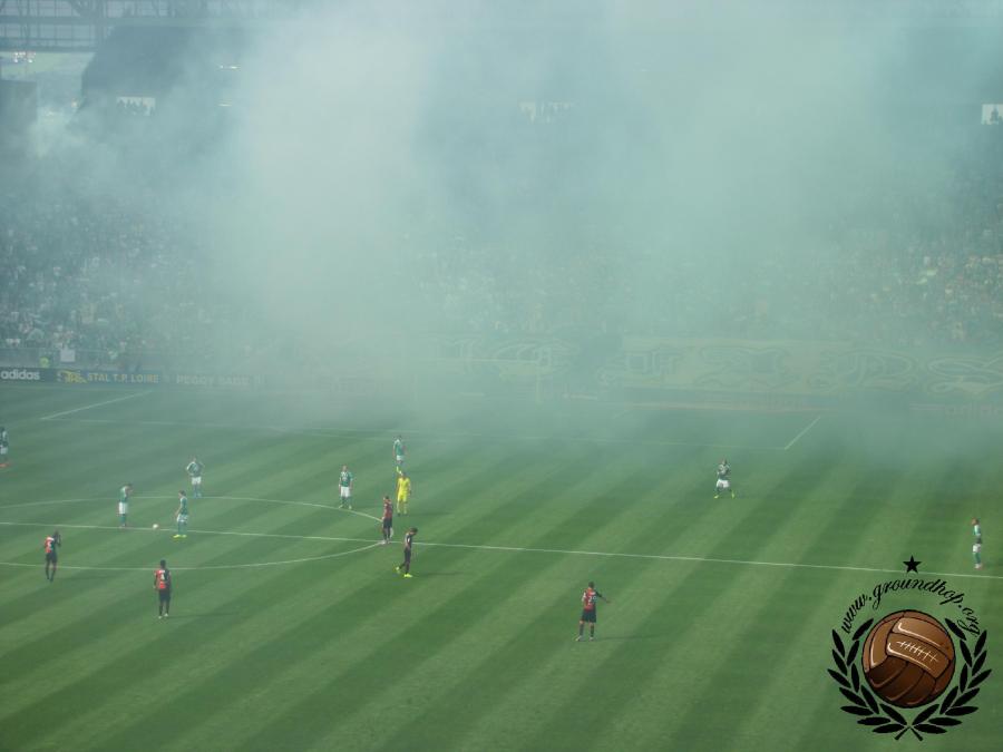 Terwijl de rook nog in het stadion hangt wordt er afgetrapt.