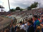 Met een bierwalm om ons heen (om 13:00, stelletje zuipschuiten) en een bedroefd gezicht leggen we alles vast, wetende dat de kwaliteit niet fantastisch zal zijn. Maar de wedstrijd begint en al snel vergeten we alles wat er is gebeurd bij het horen van het Duitse geschal. Helaas komen de gasten al binnen 5 minuten op voorsprong na afronden van Grimaldi.