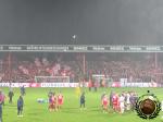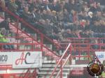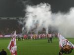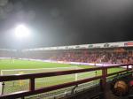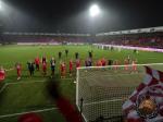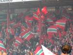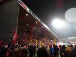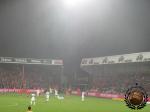 Ditmaal geen levensgevaarlijke corteo en vlak voor de aftrap betreden we onze tribune. Met een groots (georganiseerd) vuurwerk kwamen beide elftallen het veld op voor deze Zuid-West Vlaamse Derby. De Kerels (zoals Kortrijk zichzelf noemt) begonnen fel aan de wedstrijd. De eerste goal was echter voor de gasten. De eerste de beste counter zat er direct in; 0-1.