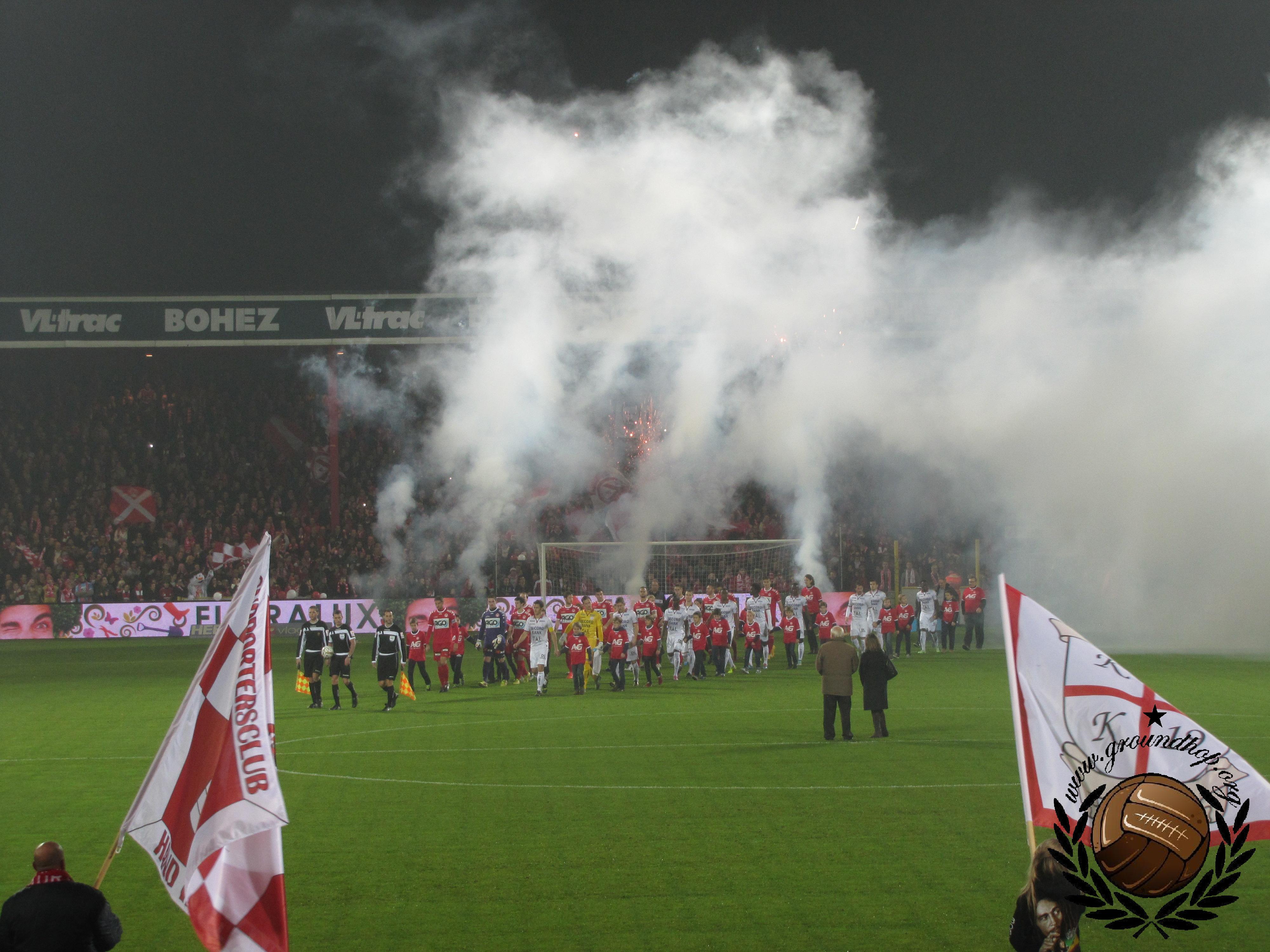 De ploegen komen tussen het vuurwerk door het veld op.