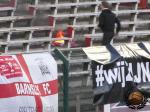 RAFC begint met een corteo met het nodige vuurwerk. Wij lopen vlak voor deze groep het stadion in, met onze pinten en sjaals al op zak. Voor dat de spelers zich gaan omkleden om te beginnen aan de wedstrijd komen ze langs om de supporters te bedanken. Antwerp toont hun respect op een zodanige manier dat de spelers van Mons ook nog langs de thuisploeg lopen om te applaudisseren. “We love you Bergen” schalt uit de Antwerpse kelen. De gasten beantwoorden dit fantastische gebaar met “Merci Anvers, merci, merci”.