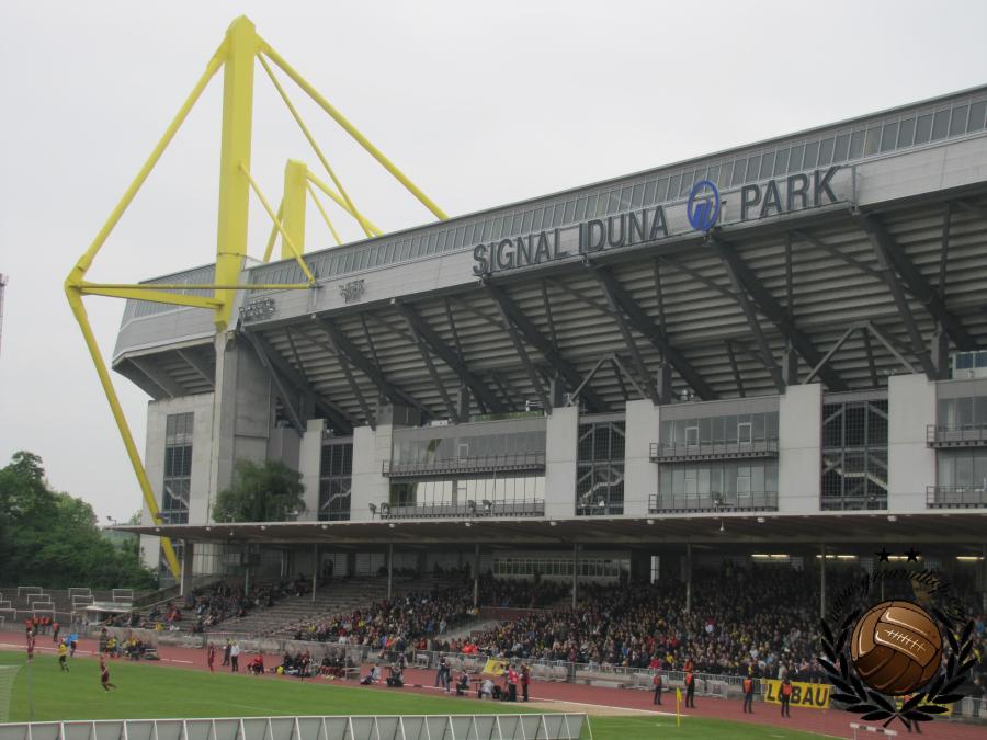 Het imposante Westfalenstadion torent hoog boven het tribunetje van Rote Erde uit.