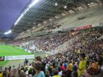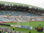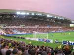 We doden onze tijd met fastfood en lopen zo langzaam mogelijk richting het stadion. Onderweg vermaken wij ons kostelijk met een gezin uit Magdeburg, dat het nodig vond om totaal gehuld in Magdeburg-kledij naar het stadion te komen. Wij herinneren ons nog een aantal Dynamo Dresden-liedjes van ons bezoekje in mei en zetten deze in. Na enkele keren achterom gekeken te hebben versnellen ze hun pas en al snel verloren wij de toch enigszins nerveuze supporters uit het zicht. Niks is hatelijker dan voetbaltoeristen die hun eigen club willen profileren op bezoek bij een andere club. Zo hadden we naast deze Duitsers bijvoorbeeld bij Atlético Madrid een stel dronken Amsterdammers die het nodig vonden om Ajax-liedjes aan te heffen in de rij voor het Calderón. Groundhoppen gaat om het opgaan in de cultuur en beleving bij een andere club, niet om te laten zien bij welke club je tweewekelijks zelf op de tribune zit.