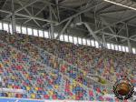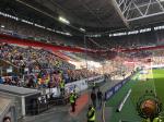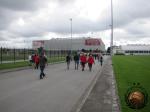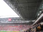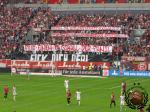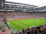 Een uurtje voor aftrap melden wij ons op de geregisseerde parkeerplaats van Fortuna. Tien minuten later hebben wij met ons beste Duits twee tickets in ons handen en daaropvolgend bestellen we zwei große Bier. Zo hoort dit in Duitsland en wie zijn wij om daar verandering in aan te brengen. Niet veel later horen wij de capo zijn eerste lied aanheffen en dit is voor ons het teken om naar binnen te gaan. Er zijn vandaag meer dan 25 duizend supporters aanwezig maar toch oogt het maar leeg. Als je bedenkt dat er 54.000 man in dit stadion past is het een simpele rekensom om te bedenken dat het stadion maar voor de helft is gevuld. Daarbij helpt het niet mee dat precies de bus met de harde kern van Kaiserlautern in de file stond en zo begint het allemaal vrij karig.