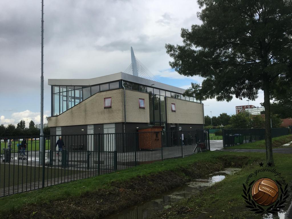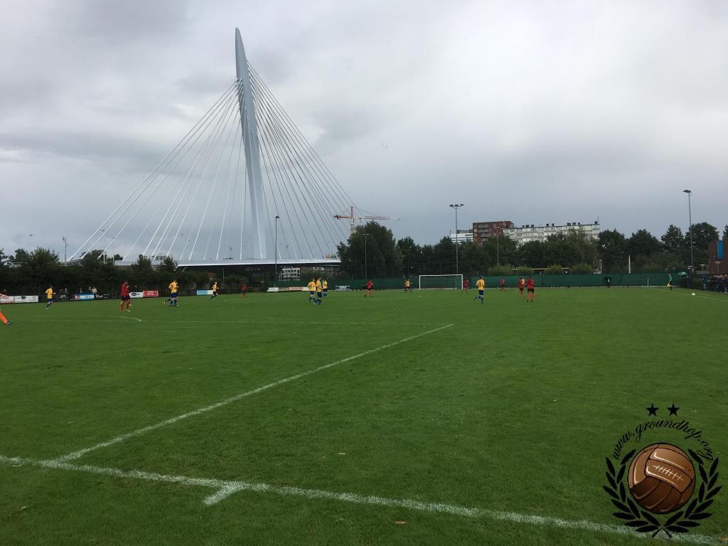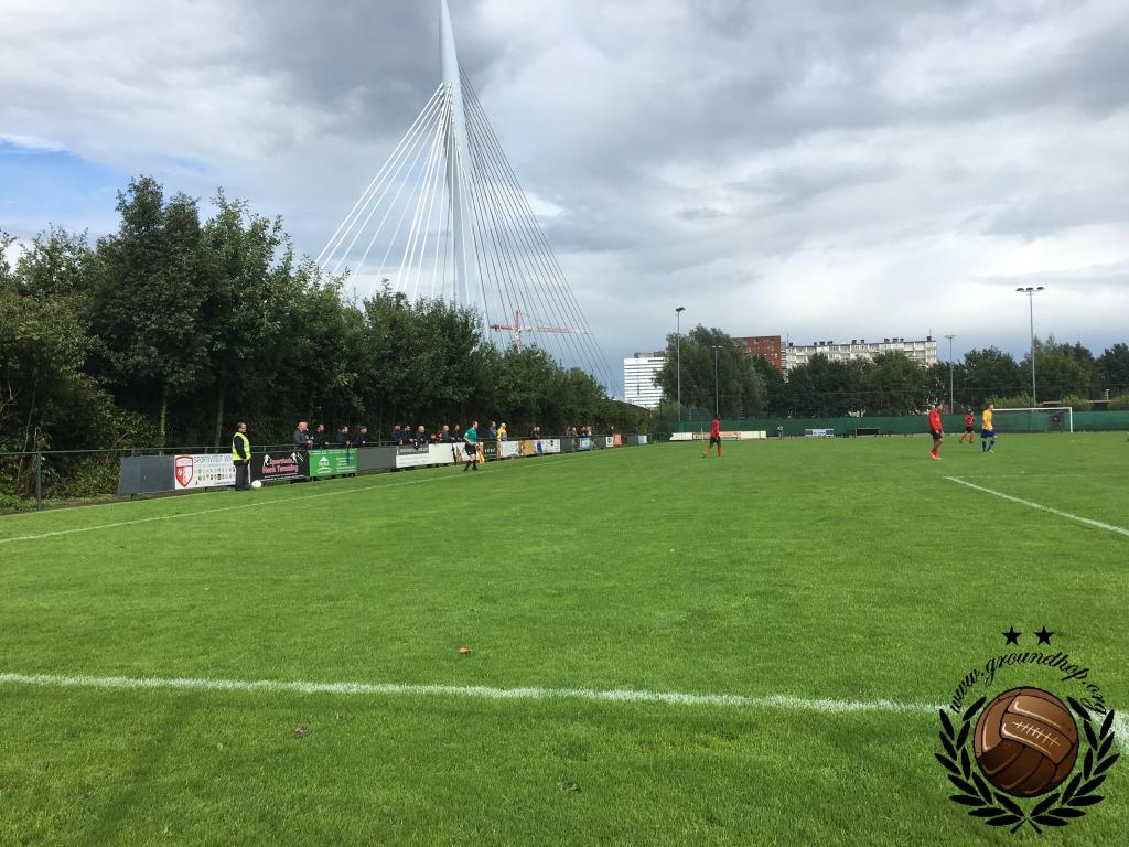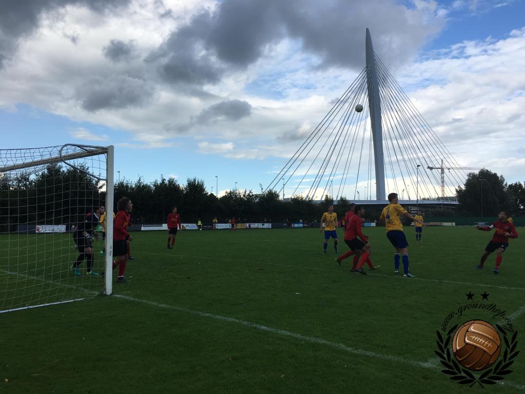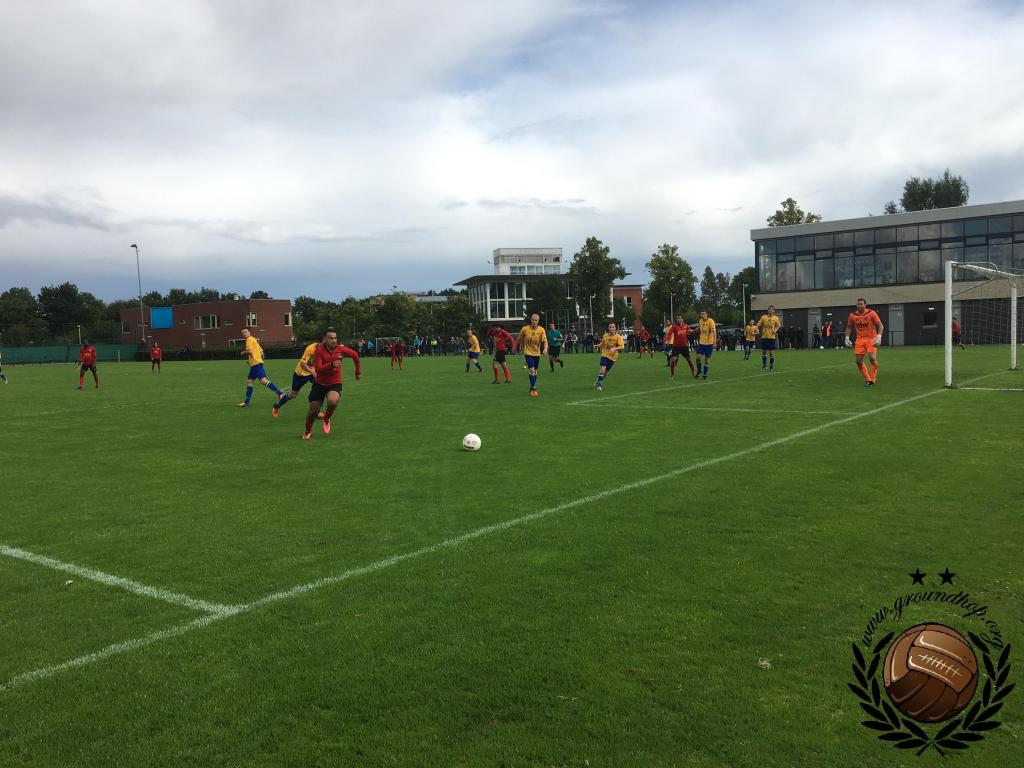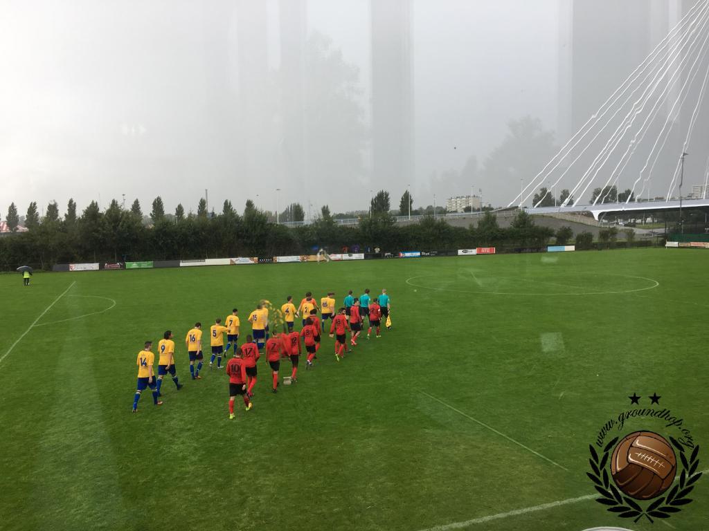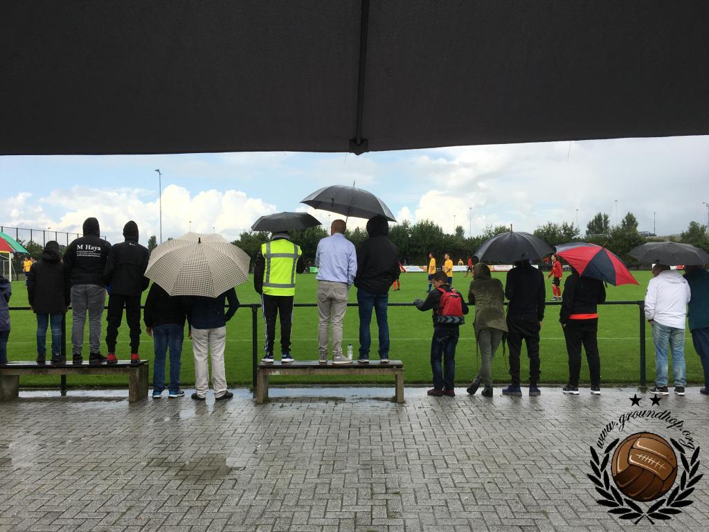 Helaas regent het pijpenstelen en zijn we nog voordat we entree betaald hebben al doorweekt. We duiken de kantine in op jacht naar een biertje en komen tot de conclusie dat dit vanwege geloofsovertuiging hier natuurlijk niet wordt geschonken. Dan maar twee koffie en vanuit de kantine zitten we het spel als oude heren van commentaar te voorzien. Het spel dat wordt voorgeschoteld is een typische Nederlandse amateurwedstrijd. De ene ploeg valt nog maar aan dan de ander, uiteraard zonder plan. Alles ziet er leuk en verzorgd uit tot een meter of 20 van het doel en daar gaat het mis.