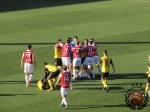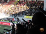 Een paar minuten later is het wederom raak voor MVV, Vermijl zet de 2-0 op het scorebord en zo lijkt het meteen beslist te zijn. De supporters komen tot dezelfde conclusie en de sfeer is ongekend. Alle tribunes zingen en springen en het feest is compleet. Er is nog een half uur te spelen maar het is overduidelijk dat Roda niet bij machte is om zich nog terug te knokken. Vlak voor tijd raakt Roda nog de paal, maar daar blijft het dan ook bij. Zo blijven de punten in Maastricht en is het voor ons tijd om door te reizen naar Meerssen. Uiteraard doen we dit niet voordat we gezien hebben of het nog compleet uit de hand loopt. Roda probeert nog uit te breken en de spelers van MVV gooien het nodige olie op het vuur, maar tot een confrontatie komt het niet meer.