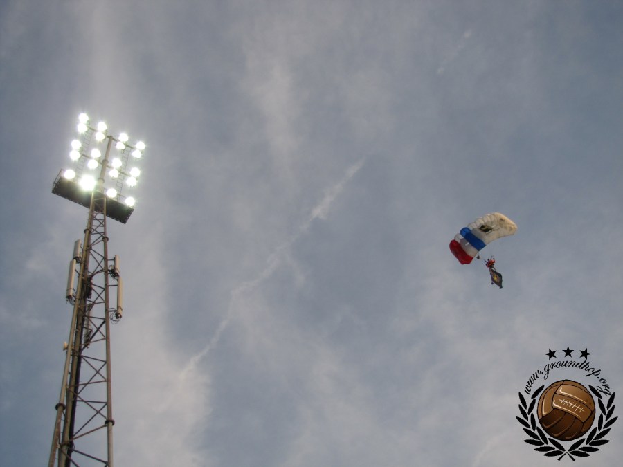 De wedstrijdbal werd met parachutisten naar het veld gebracht.