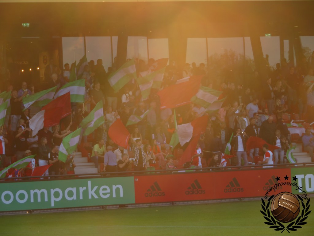 Bij de opkomst sieren rood-witte en groen-witte vlaggen de tribunes. Ook hangt er een groot doek achter de goal “Trots op jullie rood-witte hart”.