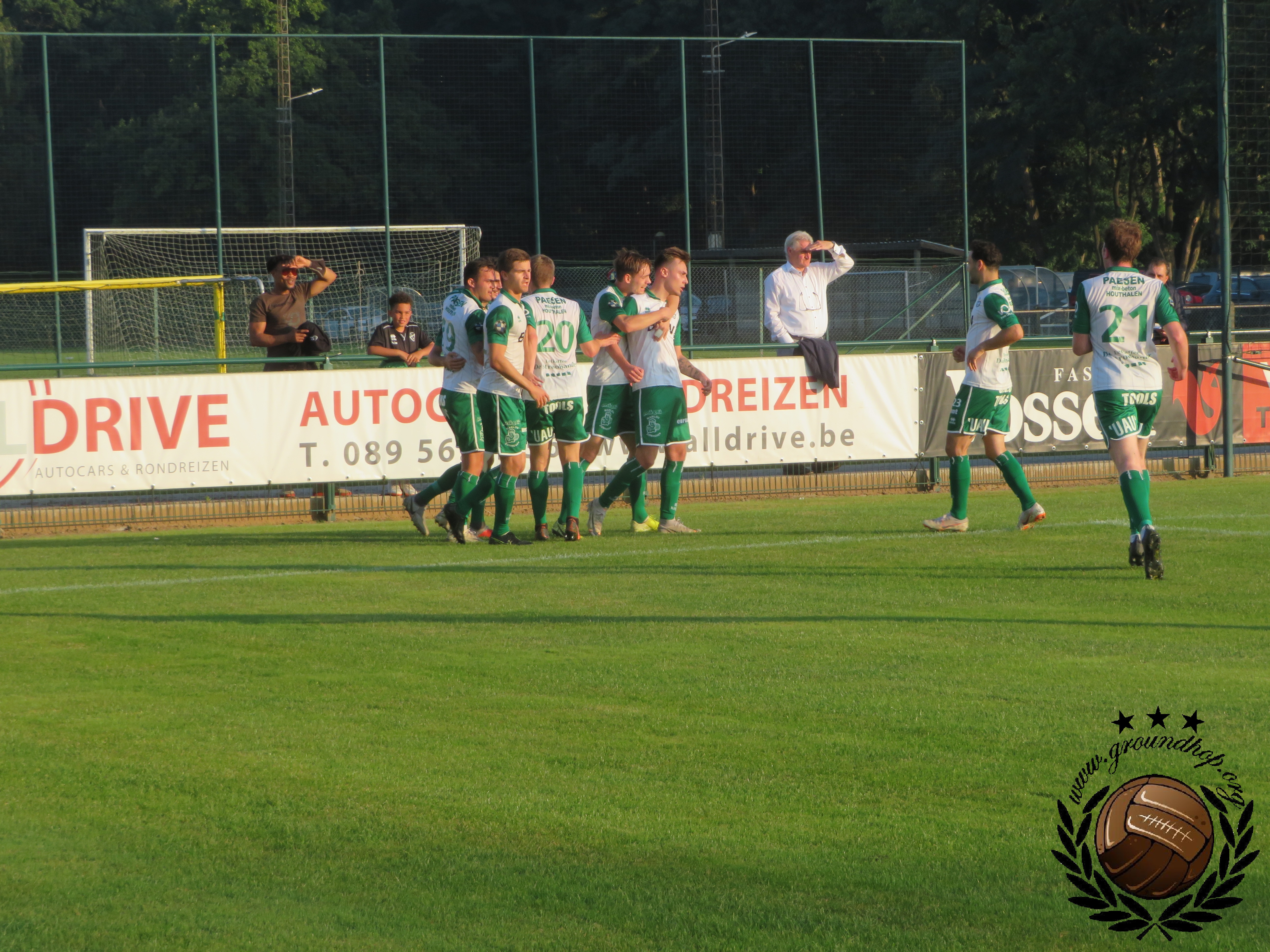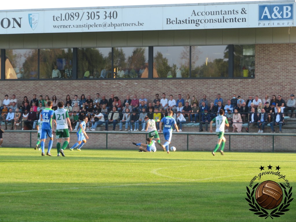 Het sportpark loopt langzaamaan vol en wanneer de gasten van Sporting arriveren is het best druk te noemen op het sportpark. Wij besluiten ons heil te zoeken aan de overkant van de tribune zodat we het leukste zicht hebben en meteen stuiten we op een supporter van Hasselt die overduidelijk veel te diep in het glaasje had gekeken die ons probeert uit te dagen. Of deze knaap op zoek was naar een knokpartij is ons nog steeds onduidelijk, maar dat het niet thuis hoort bij een wedstrijd als deze is zeker.