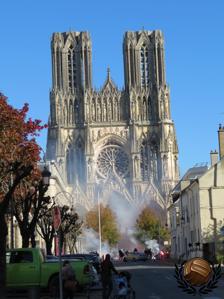 Voorafgaand aan de wedstrijd stuiten we in het centrum van de stad op een corteo van Ultrem 1995, de ultra’s van Reims. Deze groep bestond in 2020 dus 25 jaar, maar blijkbaar vinden ze dit een goede wedstrijd om hun jubileum ook echt te vieren. Dat kan heel mooi zijn natuurlijk, tegen de lokale rivaal, maar je loopt ook het risico op een zeer pijnlijke nederlaag…