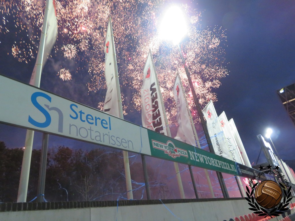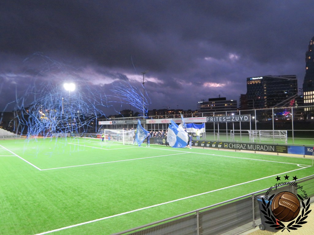 Terwijl de schemer over Goed Genoeg valt komen de spelers het veld op. De Spakenburgse aanhang laat zich gelden met vlaggen, slierten, rookpotten en gezang. De Amsterdammers klappen vanaf de tribune voor een professionele vuurwerkshow, welke achter de onoverdekte tribune wordt afgestoken. Het verschil is direct duidelijk.