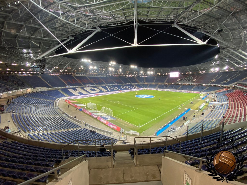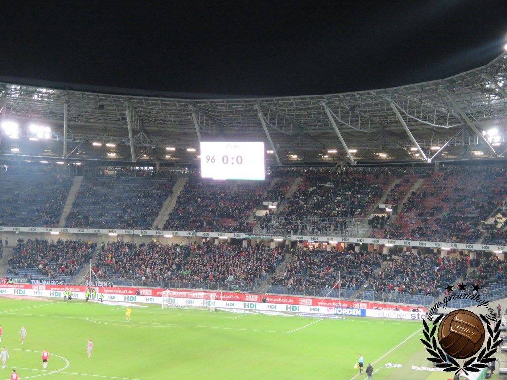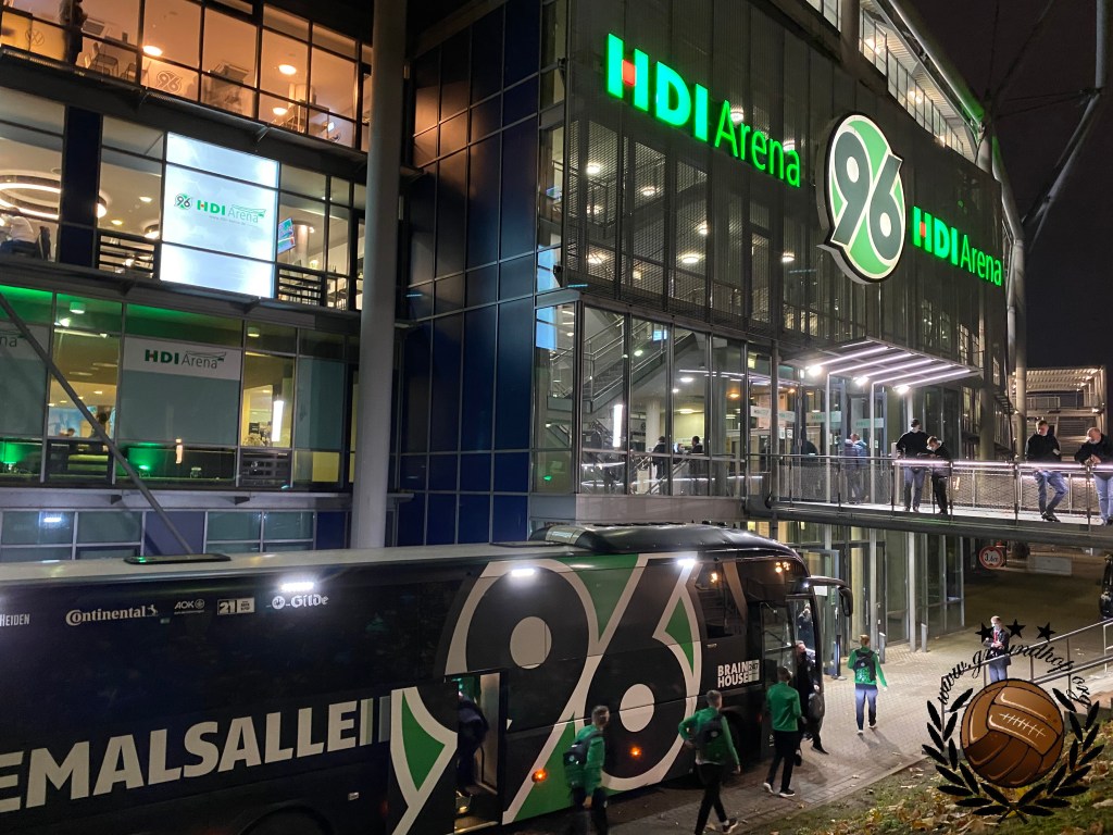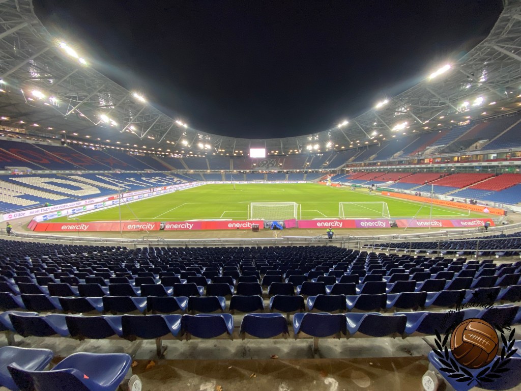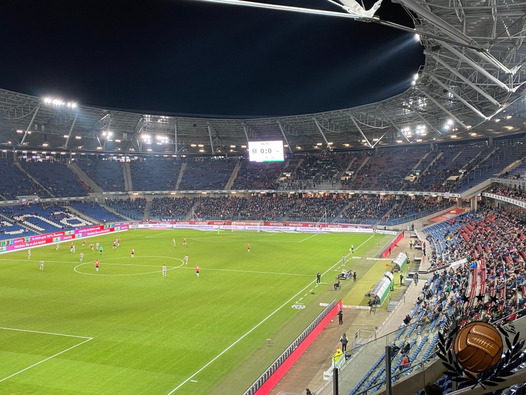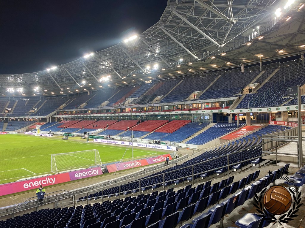 Werken kan gelukkig vanuit de auto en daarom vertrekken we al vroeg op de vrijdag richting de eerste halte van het weekend. Het einddoel is Leipzig, maar wij besluiten om via Hannover en daarna Braunschweig naar Oost-Duitsland te trekken. Uiteraard komen wij met nog uren te gaan op onze bestemming aan en daaropvolgend staan we nog voor de poorten open gaan al te wachten om naar binnen te mogen. Aangezien het vooral koud en grijs is besluiten we om maar direct een sjaal aan te schaffen. Degene die ons helpt spreekt verbazingwekkend genoeg Nederlands dus dit was een fluitje van een cent. Niet veel later moeten wij onze talen dan wel aanspreken op jacht naar een halve liter bier en een heerlijke bratwurst. Ook hier slagen wij uiteraard in en zo zitten we nog een uur voor de wedstrijd al klaar op onze tribune. Al snel merken we dat het vandaag niet in de buurt van vol zal geraken, al is dat ook niet heel vreemd in de HDI-Arena welke qua capaciteit is ingericht op het Wereldkampioenschap van 2006.