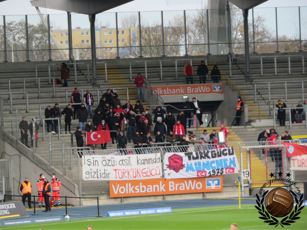 Ook hier zijn vandaag geen actieve ultra’s aanwezig. Als we de sprüchbander mogen geloven heeft het iets te maken met de directie van de club, maar feit blijft dat het er niet veel sfeervoller op wordt. De gasten uit München brengt een man of 50 mee. Dit valt ons eigenlijk nog goed mee als je kijkt naar de leeftijd van de club, de afstand en het weer.