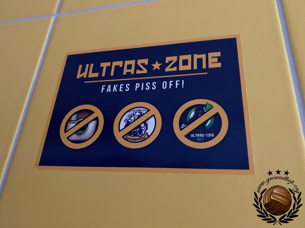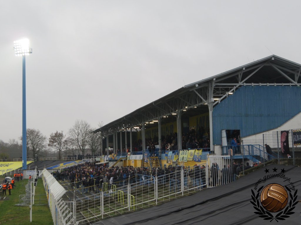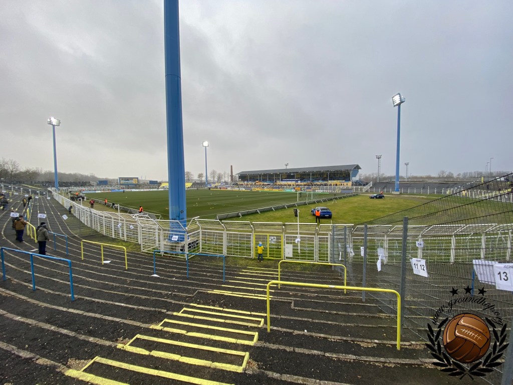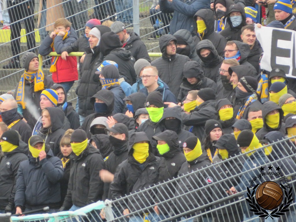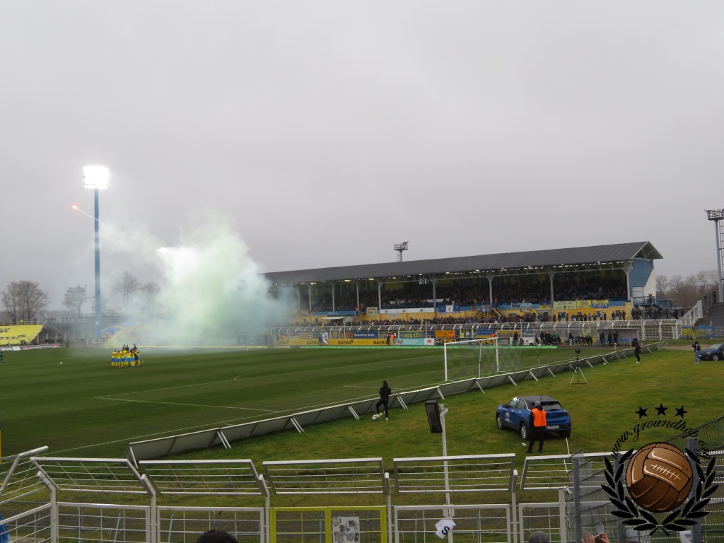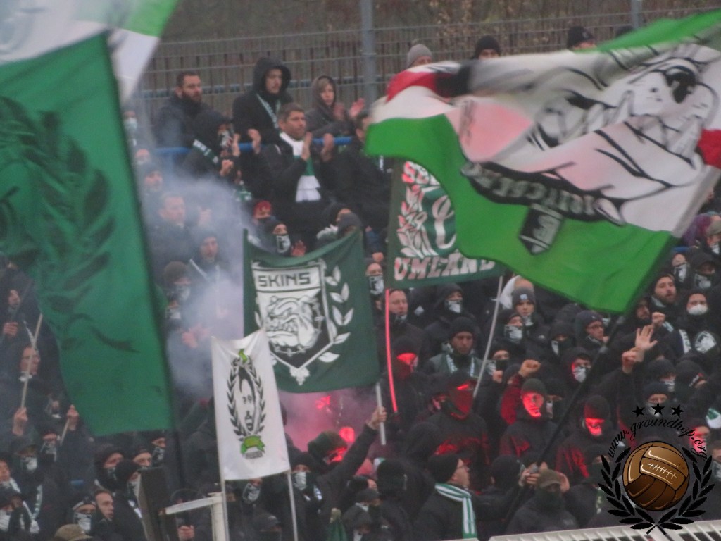 Ze hebben hier bij Lokomotive, dat door de Stasi benoemd was als officiële club van de spoorwegen, wel een hekel aan groundhoppers. Wij zijn dus iets voorzichtiger dan normaal met het maken van foto’s rond de aftrap, al staan we op een redelijk normaal vak. Uiteraard laten we ons niet tegenhouden dus zetten wij alle acties rondom de aftrap keurig op de foto. De gasten uit Leutzsch trappen het bal af met een lading fakkels en zodra deze actie voorbij is besluit de thuisploeg ook dat het tijd is tot het afsteken van vuurwerk. De rookpotten missen een beetje zijn kracht omdat ze door elkaar worden afgestoken en blauw met geel gemixt maakt groen, wat natuurlijk niet de bedoeling kan zijn aangezien deze kleur zeker te associëren is met de gasten.
