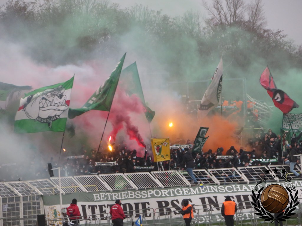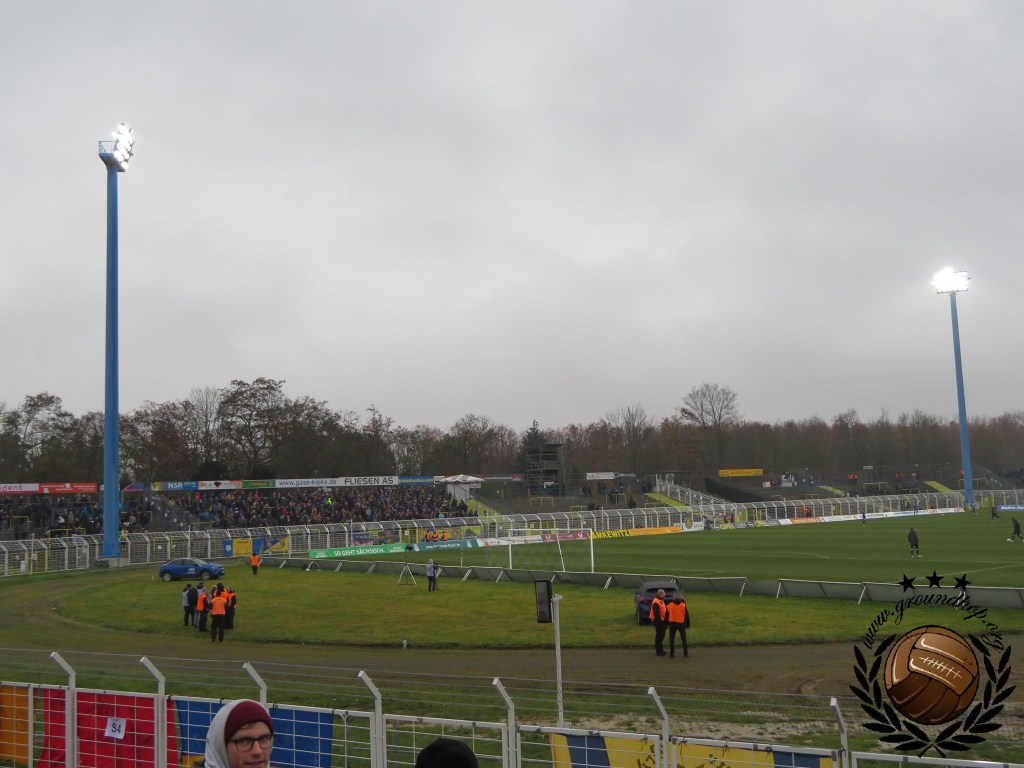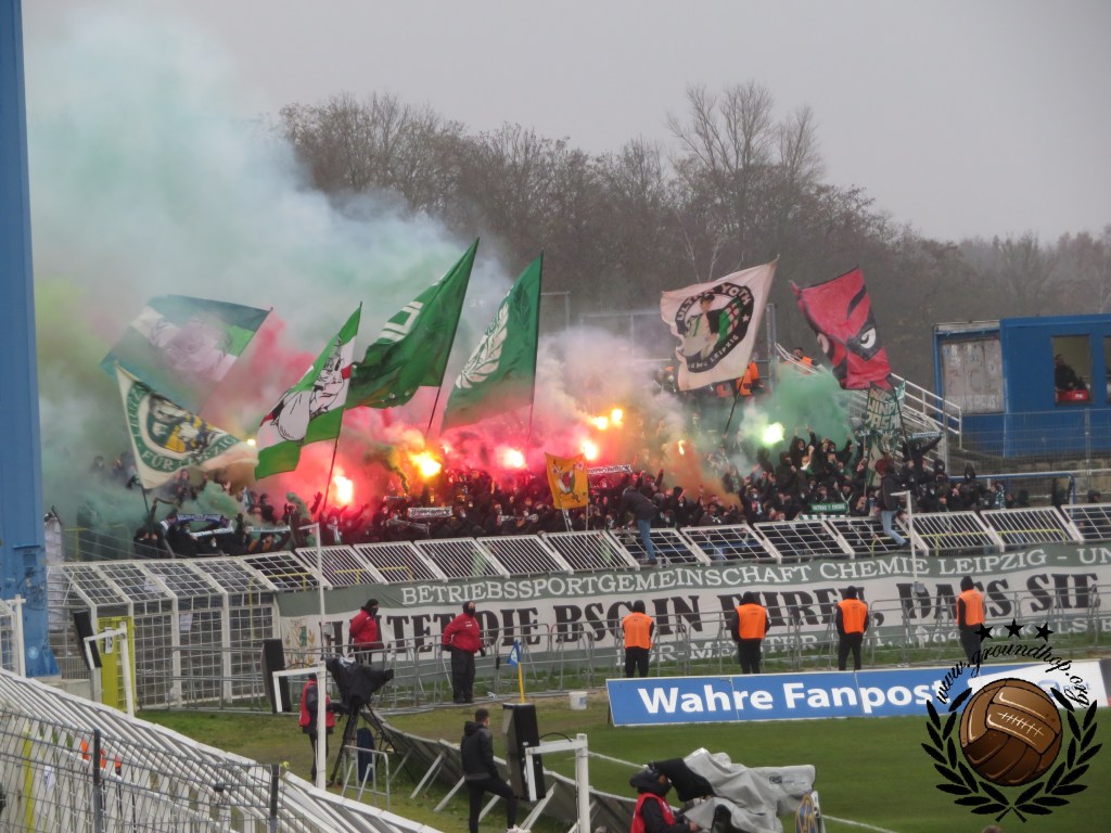 Vanuit ons hotel in Probstheida zijn we op loopafstand van het Bruno-Plache-Stadion en al een kilometer voor het stadion merken we dat er meer dan gemiddeld kale koppen zijn. Ten midden van alle skinheads lopen we richting het stadion. Gelukkig voor ons zijn we allebei blanke jongens, anders hadden we waarschijnlijk de poorten van het stadion niet eens gehaald. Eenmaal bij deze poorten doorlopen we voor de vierde keer dit weekend alle maatregelen, al is het zeker verbazend te noemen dat dit by far de makkelijkste controle is. Zeker aangezien ze hier bij Lokomotive best wel gek zijn op vuurwerk. Echter zou het ons ook zeker niet verbazen als deze controle voornamelijk voor de show was. Eenmaal binnen lijkt ons gevoel te kloppen want nog ver voor de aftrap proberen supporters van de thuisploeg complete vuurpijlen richting het vak van Chemie te schieten. Raak zijn ze niet, al zat het er niet heel ver vandaan.