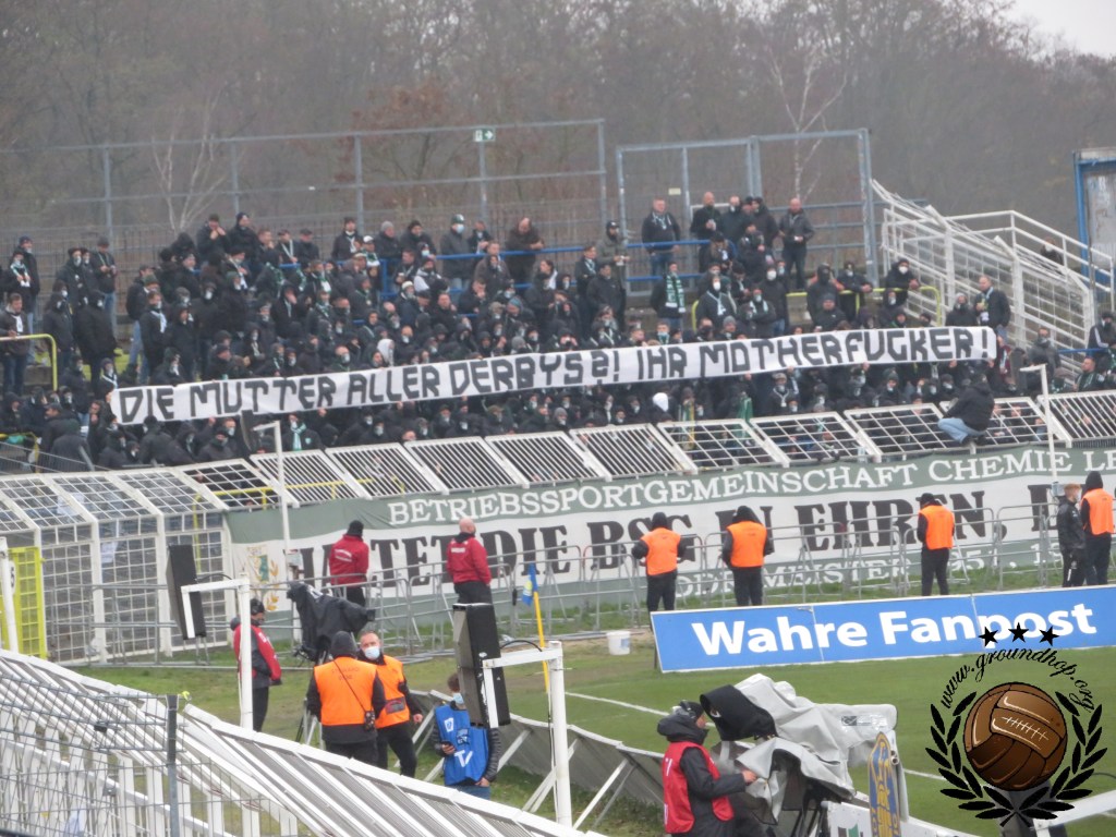 De wedstrijd zelf staat bol van spanning, wat het spel zelden ten goede komt. De thuisploeg komt aanzienlijk beter uit de startblokken, zonder echte kansen te kunnen creëren. Achterin bij Chemie staan echte strijders welke ook binding lijken te hebben met de club want ze proberen alles wat ook maar in de buurt van het doel komt met huid en haar op te vreten. Voorin lukt het de gasten echter niet om potten te breken en komen ze niet veel verder dan een rollertje voorlangs. Op de tribunes is het daarentegen duidelijk Chemie dat met de scepter zwaait. De gasten maken er 90 minuten lang een feestje van, waar Lokomotive zich vooral beperkt tot schreeuwerige kreten. Het uitvak is dan ook het merendeel van de wedstrijd de baas in het Bruno-Plache-Stadion. Je zou zeggen dat de thuissupporters dit niet over hun kant zouden laten gaan, maar niet blijkt minder waar. Wij besluiten voor rust al dat we stiekem voor Chemie zijn, al zouden we dit ten midden van al deze neonazi’s niet moeten laten blijken.