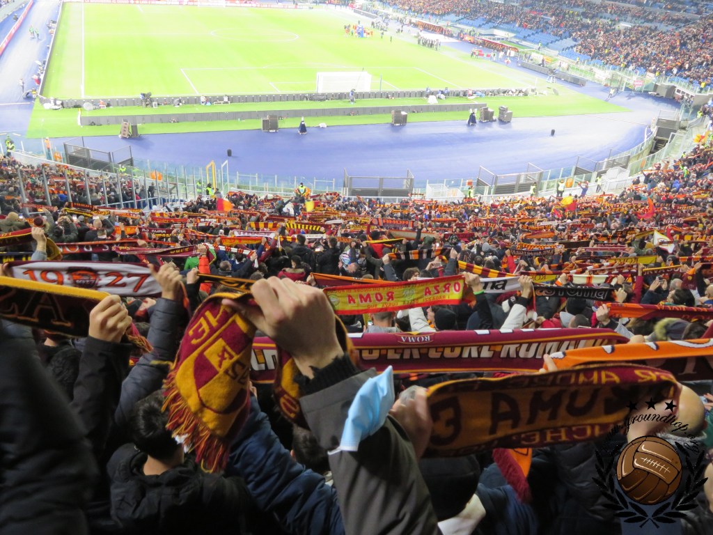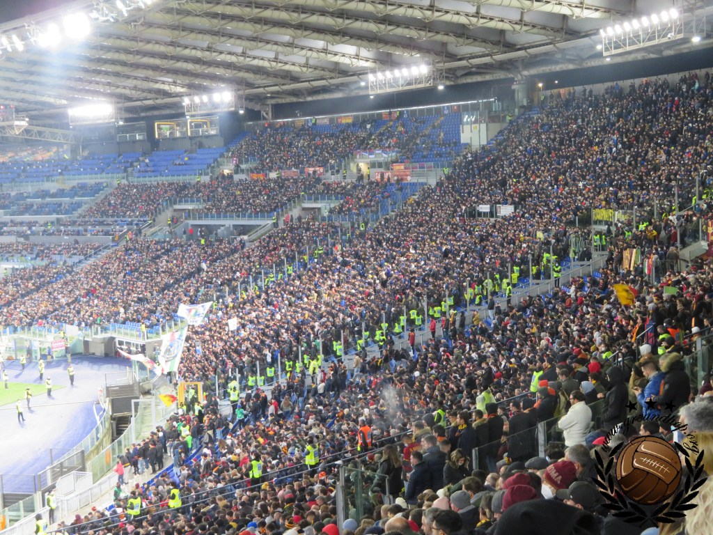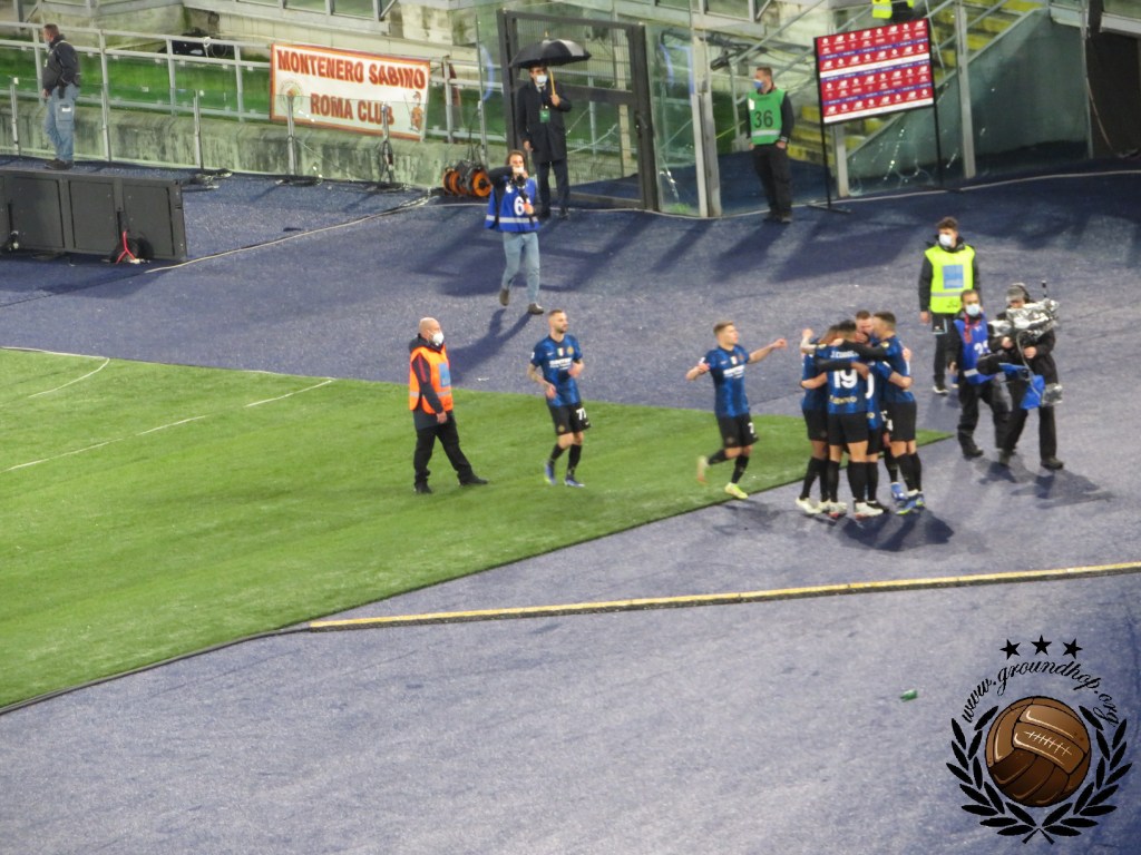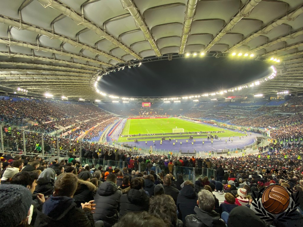 We zijn ruim op tijd bij het Stadio Olimpico en dat is maar goed ook. We zijn wel wat gewent qua controles vanuit Buenos Aires, maar de Italianen kunnen er ook wat van. Vijf controles moesten we door voordat we het stadion konden betreden: eenmaal de Coronacontrole, tweemaal een fouillering en tweemaal een check op toegangsbewijs + identificatie. Het kost wat moeite, maar dan heb je ook wat. Een topper in de Serie A in een goed gevuld Stadio Olimpico. Enkel in de vakken waarvan de kaarten rond de €100 lagen blijven stoeltjes leeg. Ook Inter is met een groot uitvak ook massaal aanwezig.