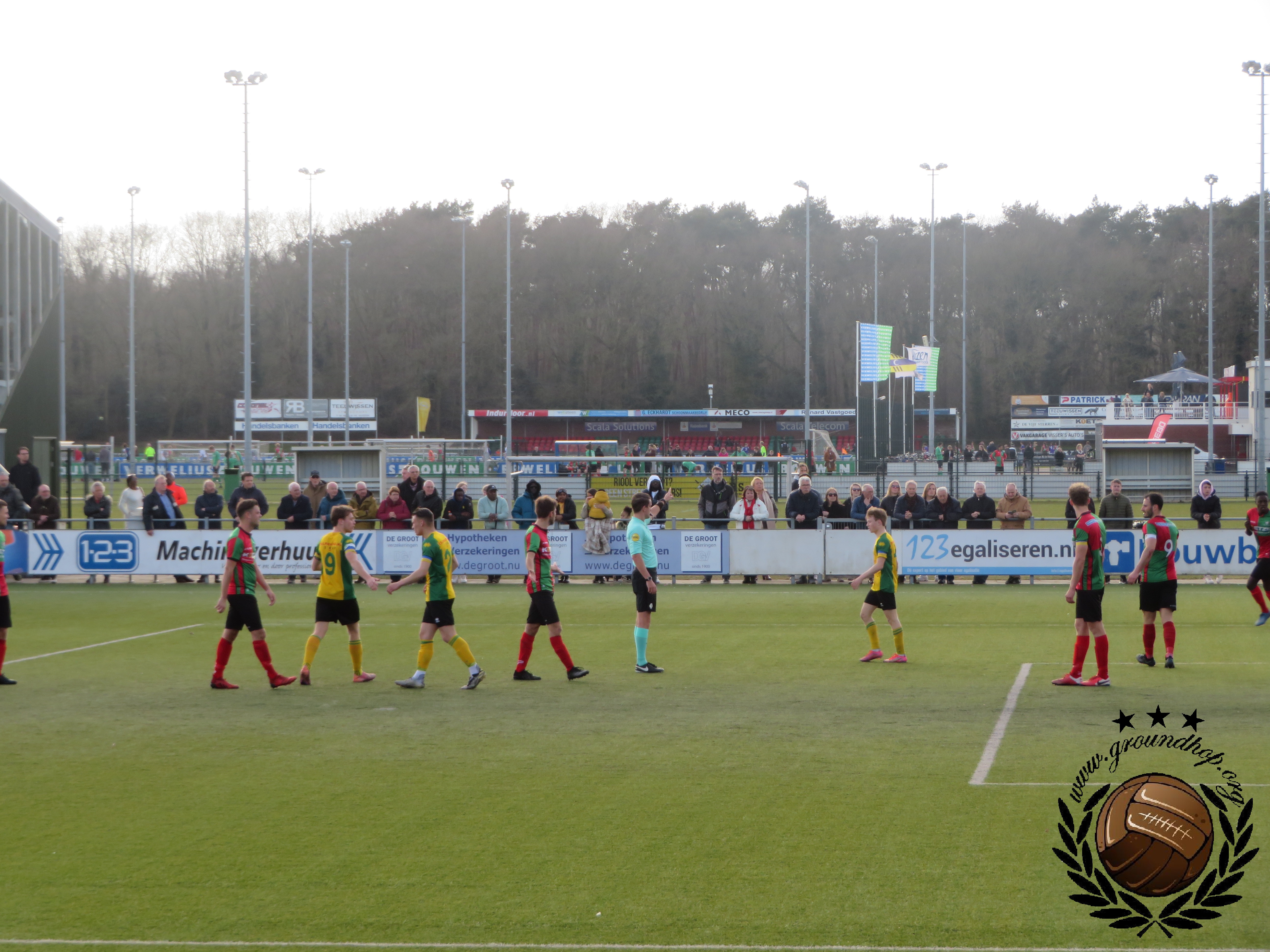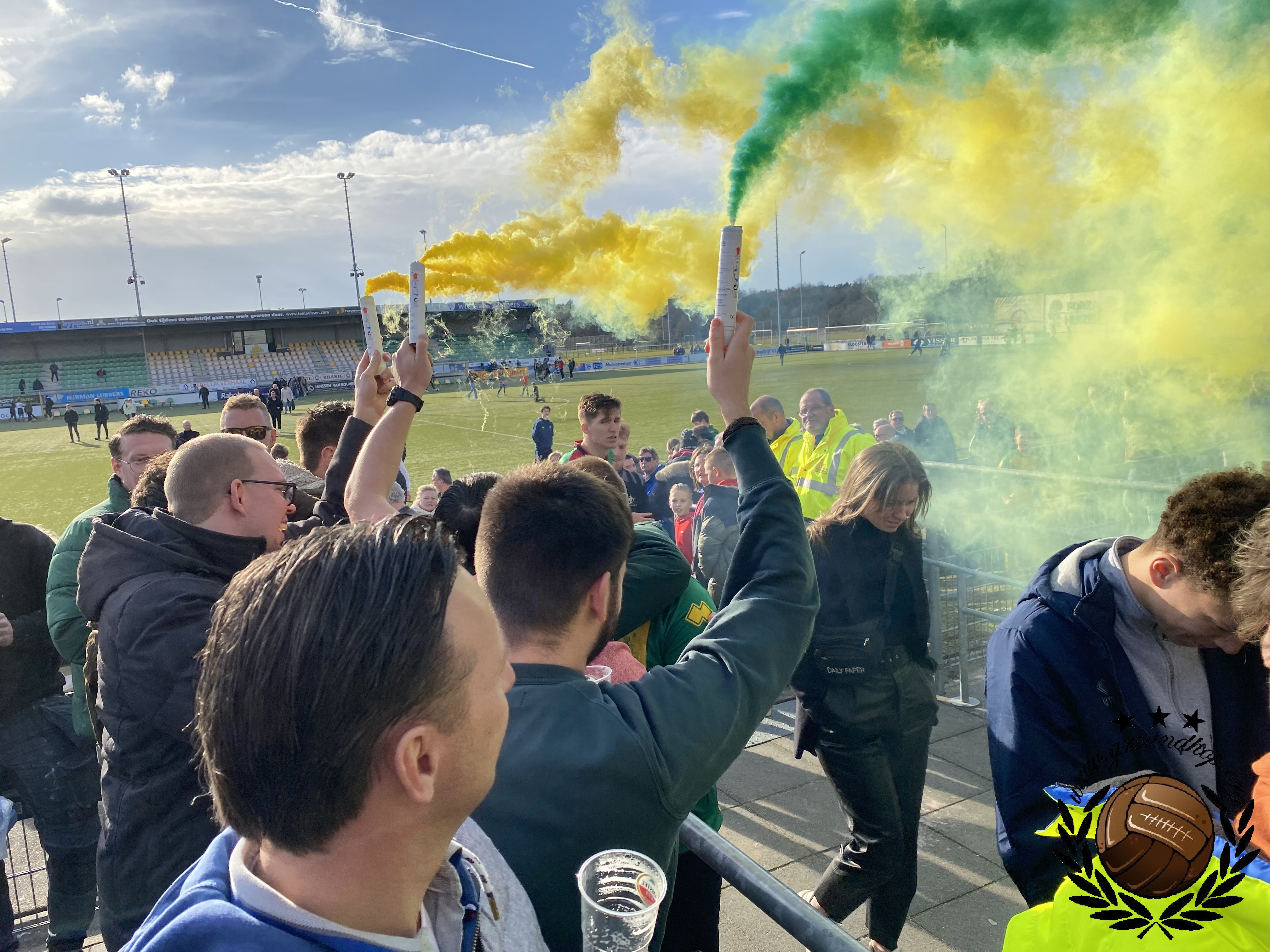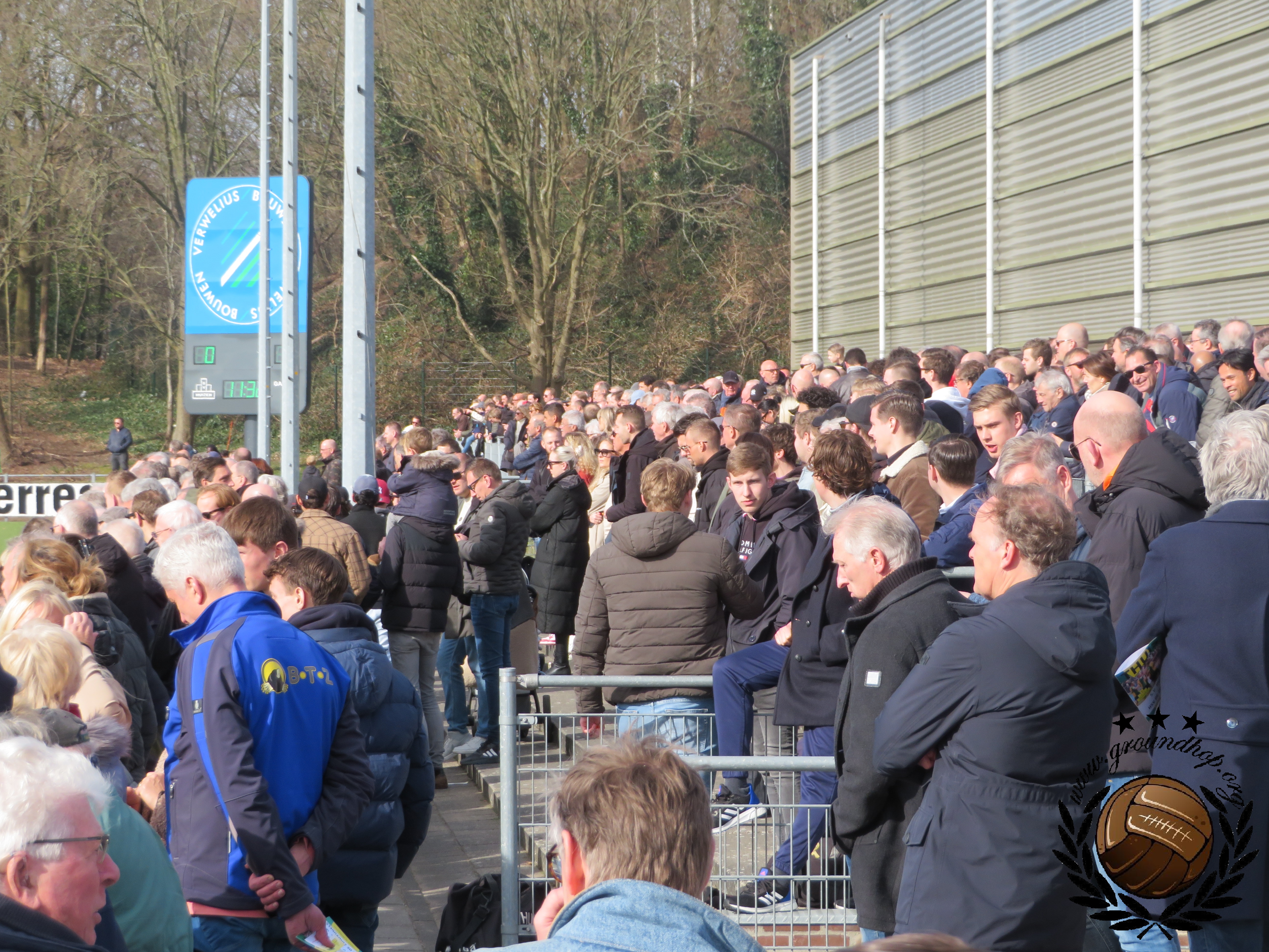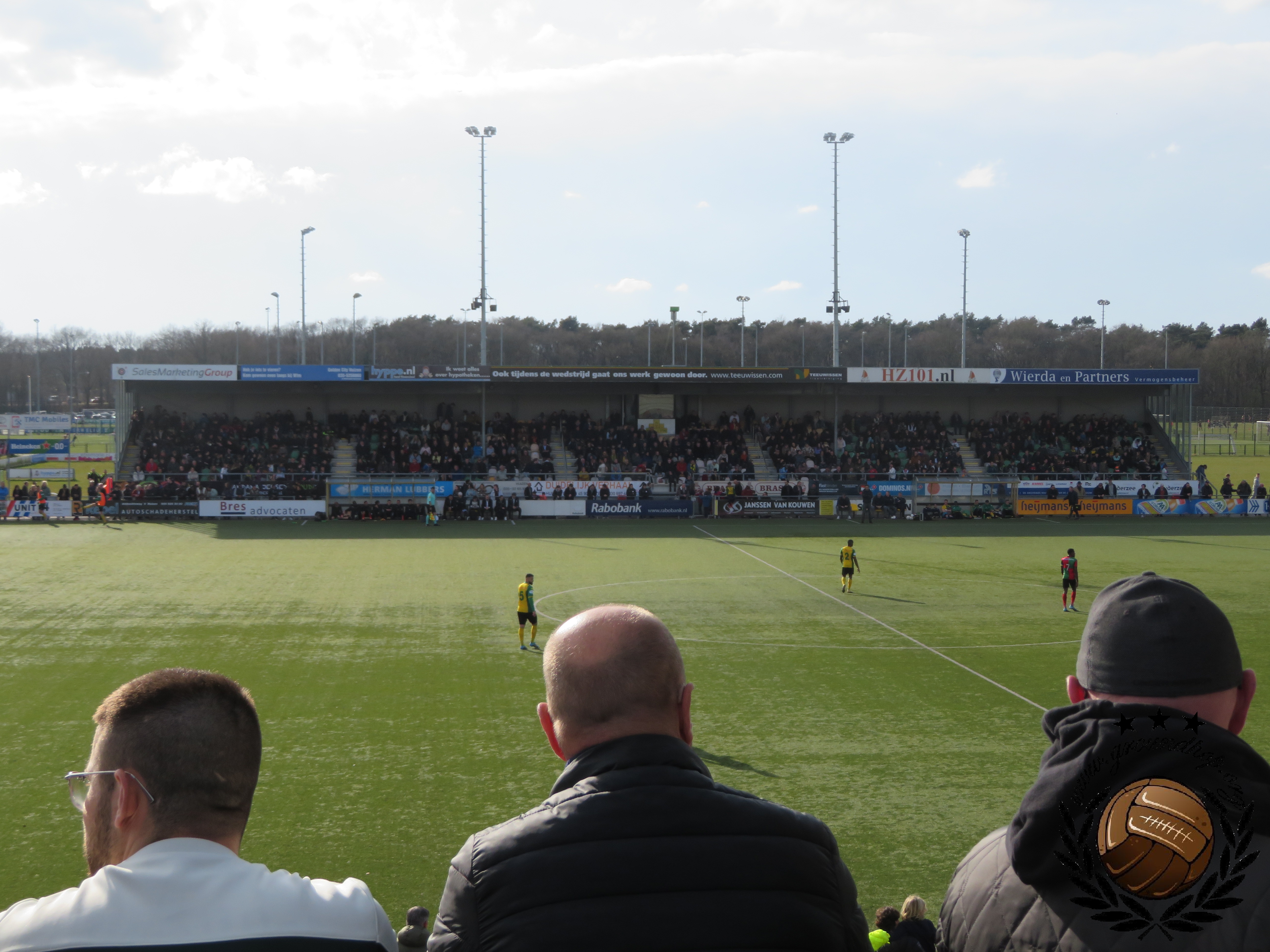 De brilstand bij rust dus, die we gebruiken om een biertje en een portie kibbeling te scoren op het overvolle terras. Blijkbaar had iemand in het Gooi bedacht dat het leuk is om de wedstrijd te laten omlijsten door een drumband, wat dus de nodige herrie oplevert.