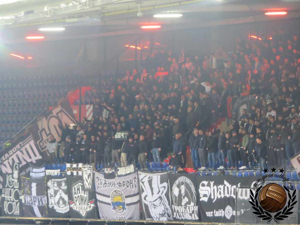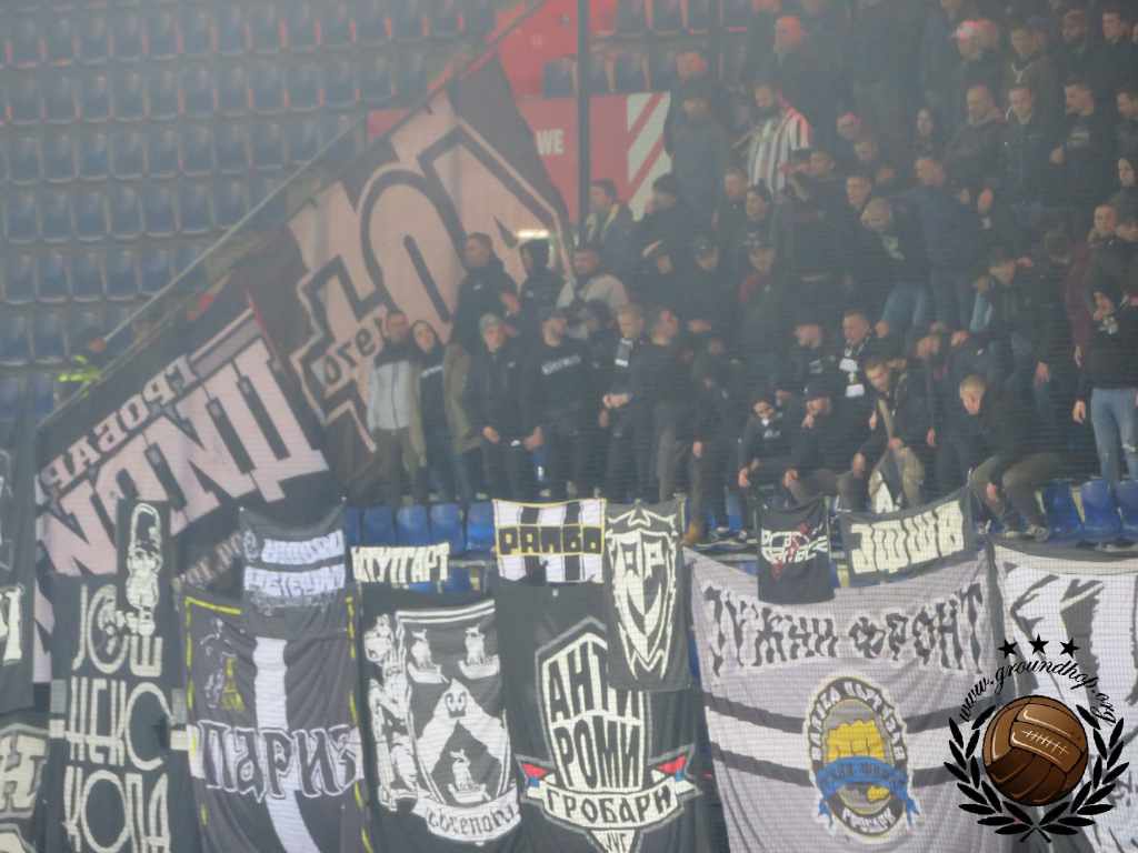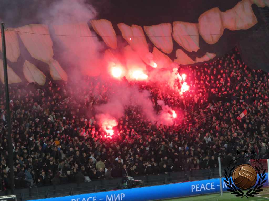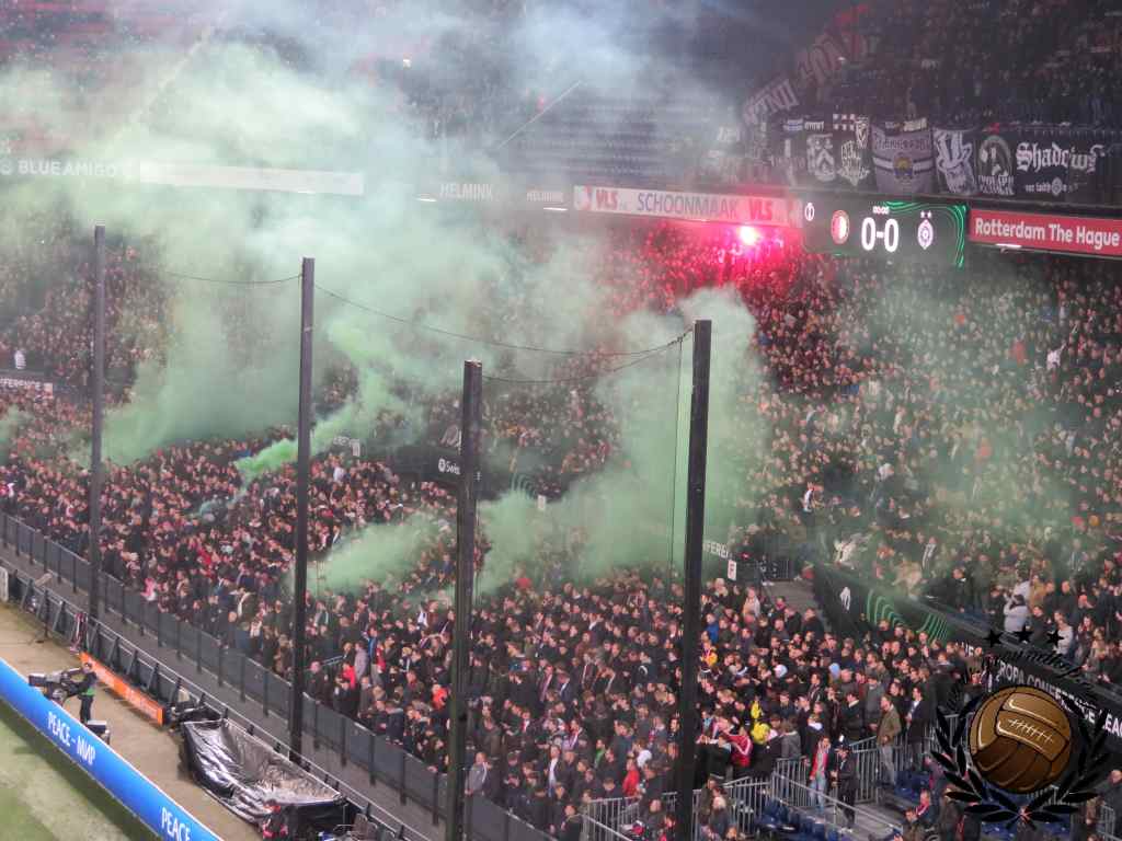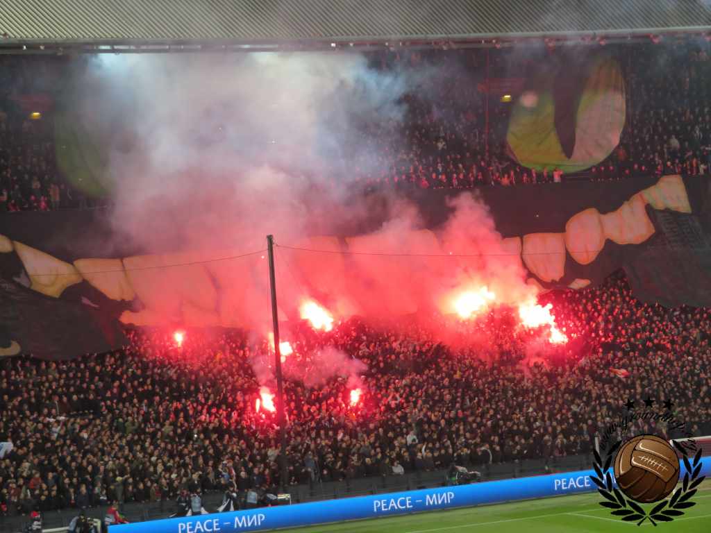Wij beginnen al een paar uur voor de wedstrijd op Varkenoord voor de nodige alcoholische versnaperingen. Het moment dat we wat vuurwerk vanuit de buurt van De Kuip zien komen is voor ons het sein om ons maar eens even naar onze plekken te begeven. Waar we normaliter graag op de Stadionzijde staan, hebben we ditmaal kaarten gehaald voor een elitair vak, zodat we de gasten uit Belgrado qua support een eerlijke kans kunnen geven. Ondanks de grote achterstand zijn er toch zo’n 600 gasten uit Belgrado gekomen, en dan hebben we het nog niet gehad over het nodige Servische gebrabbel dat we zo hier en daar horen op de thuisvakken.