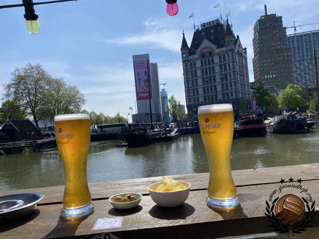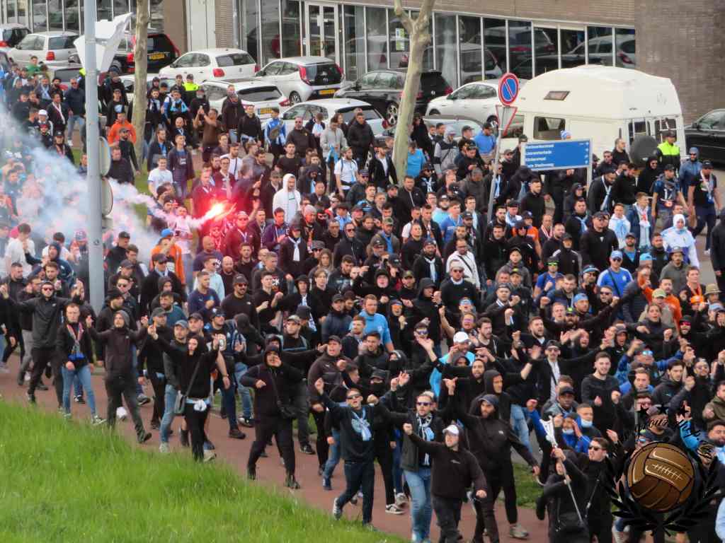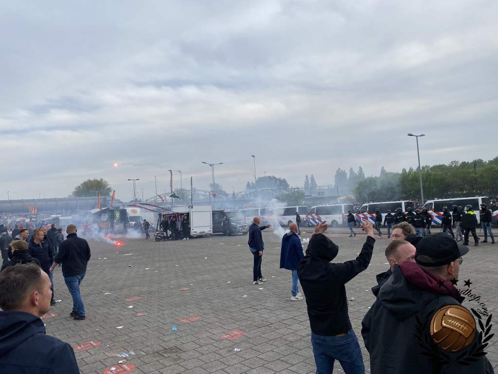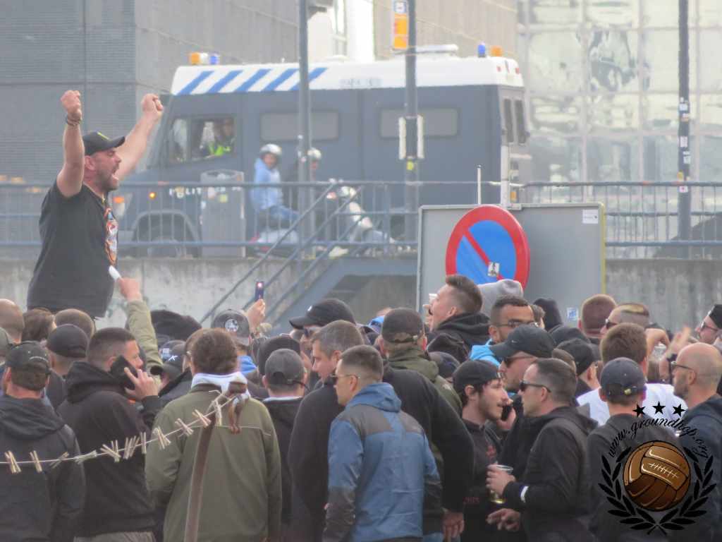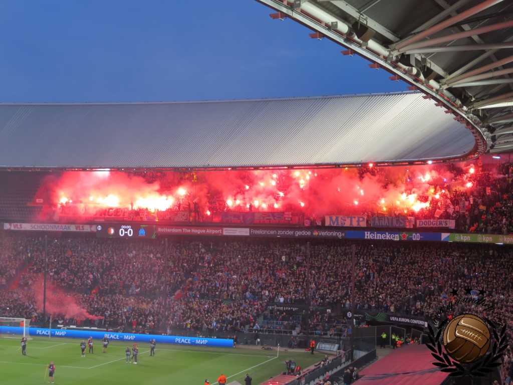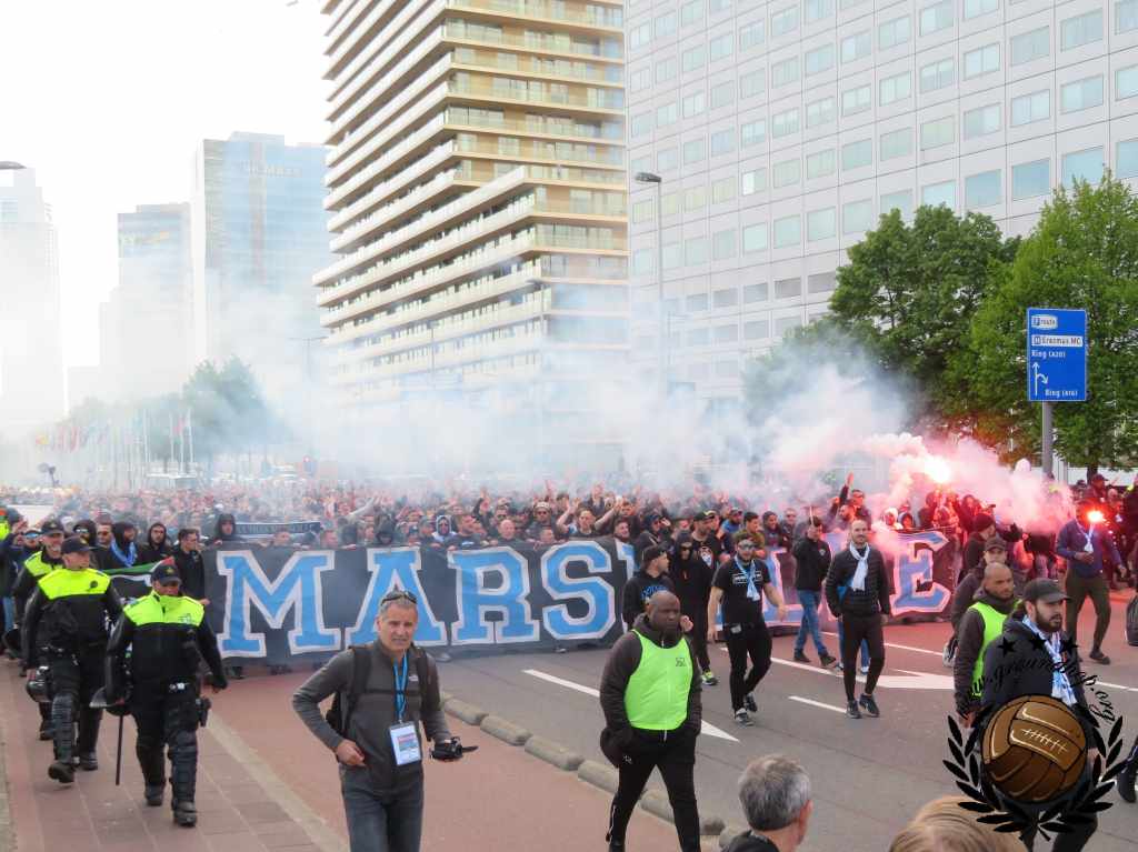 Twintig jaar geleden is het dat Feyenoord voor het laatst in een Europese halve finale stond. Dat we het er dus van moeten nemen deze keer is vanaf het eerste moment duidelijk. Vroeg in de middag trekken we dan ook al richting Oude Haven om ons naast de fanzone van Marseille, in het zonnetje, op een terras te positioneren. De 1.500 supporters van l’OM dienen daar ook te verzamelen en rond 18:00 trekken ze in één grote stoet richting de Kuip. Dit gaat redelijk vlekkeloos, tot het moment dat ze Stadionplein opgestuurd worden. Daar vliegt het één en ander over en weer aan fakkels, flesjes en een enkele steen.