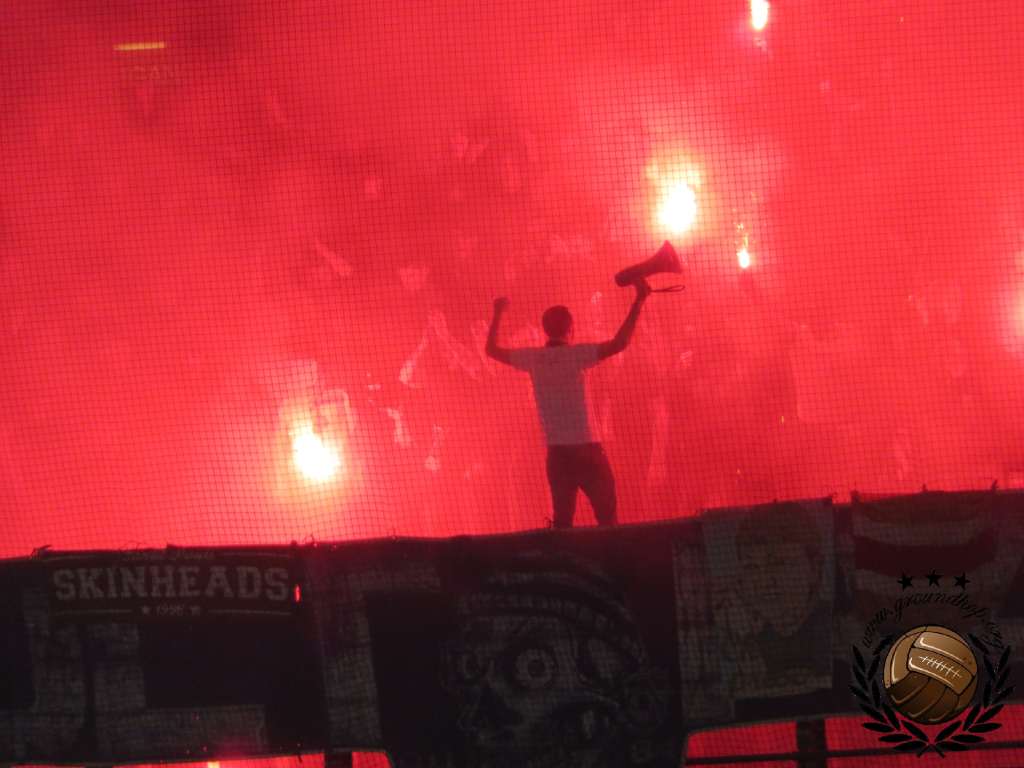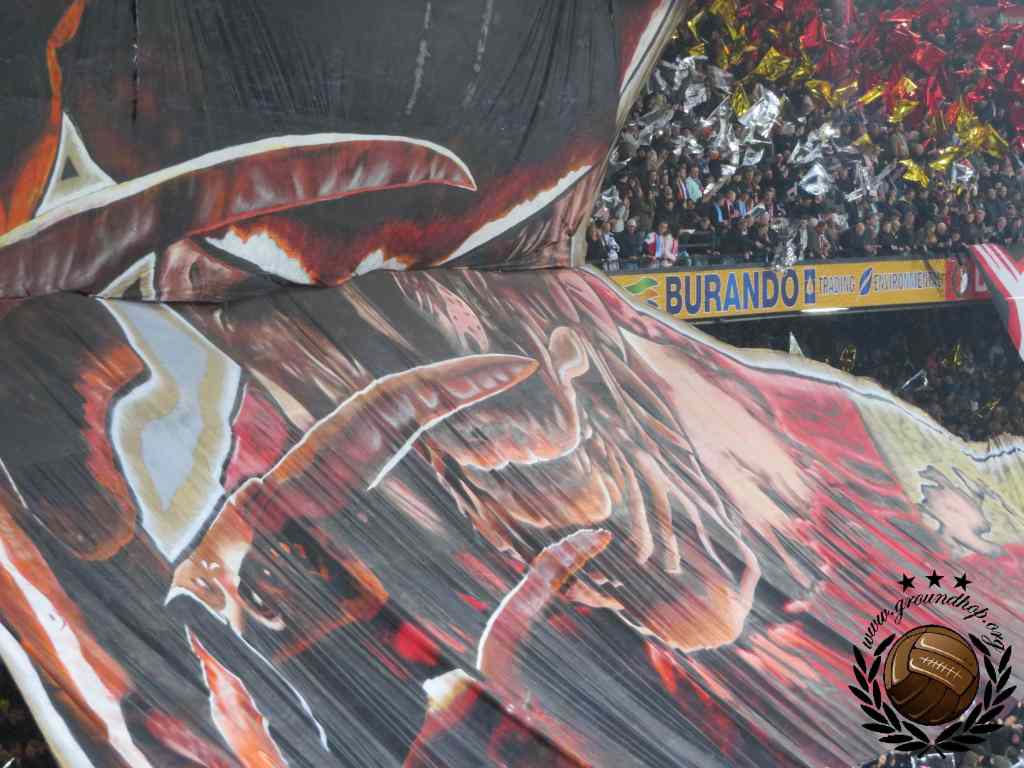 De opkomst is vervolgens één groot spektakel. “Never stop dreaming” valt er te lezen op de grootse sfeeractie die de hele Noordzijde bedekt. Uiteraard gaat dit doek gepaard met de nodige fakkels en rookpotten. Ook de Marseille-supporters, die over drie verschillende vakken zijn verspreid, laten zich niet onbetuigd. In de gauwigheid tellen we toch alweer de doekjes van vijf of zes verschillende ultragroepjes aan de plexiglaswand, en allemaal heb ze het nodige vuurwerk mee naar binnen weten te krijgen.