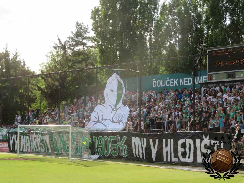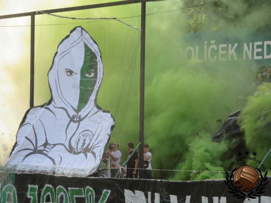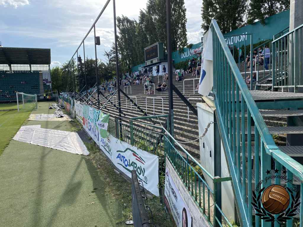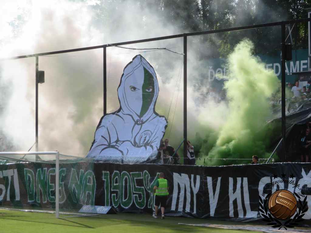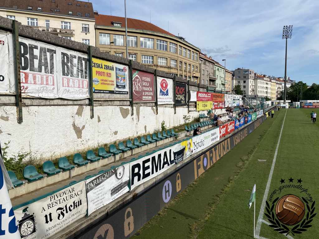 Wij bestellen in het Engels onze biertjes, want dat kunnen ze hier in Praag. Dat maakt het aanzienlijk makkelijker aangezien ons Tsjechisch nog steeds aan de roestige kant is. Met deze makkelijk gehaalde biertjes in de hand nemen we plaats op de kleinste tribune. Wij hebben kaarten voor rij drie. In een gemiddeld stadion denk je dan redelijk vooraan te zitten maar hier niet het geval. De derde rij is hier tevens de bovenste en achter ons is de wildgroei aan onkruid al even gaande. Nadat we onze groene vingers hebben laten spreken en zonder onkruid in onze naad kunnen zitten, ploffen we neer en zien we het allemaal wel wat deze degradatiekraker ons te bieden heeft. De supporters beginnen in ieder geval met een lading vuurwerk en een mooie tifo, dus dat beloofd veel voor de wedstrijd.