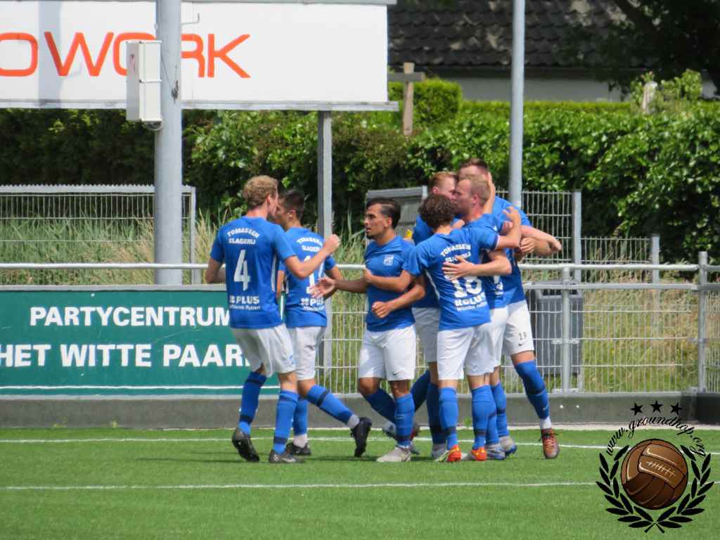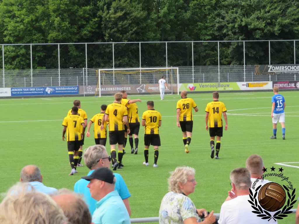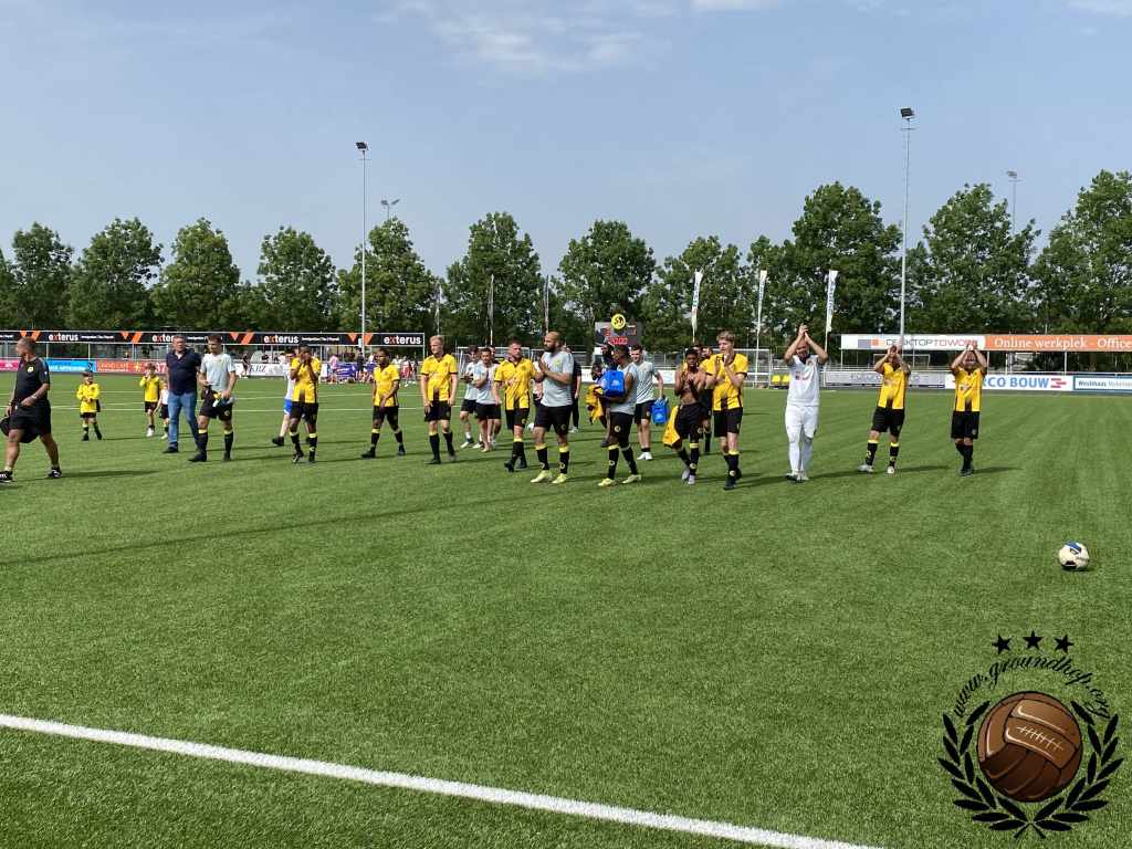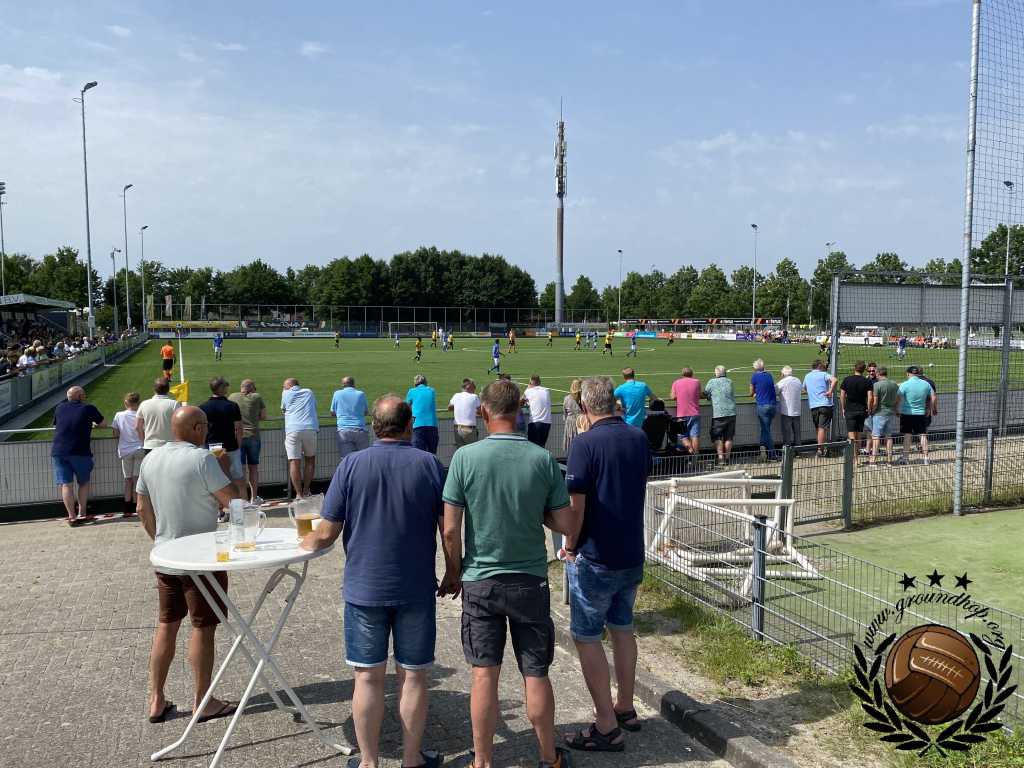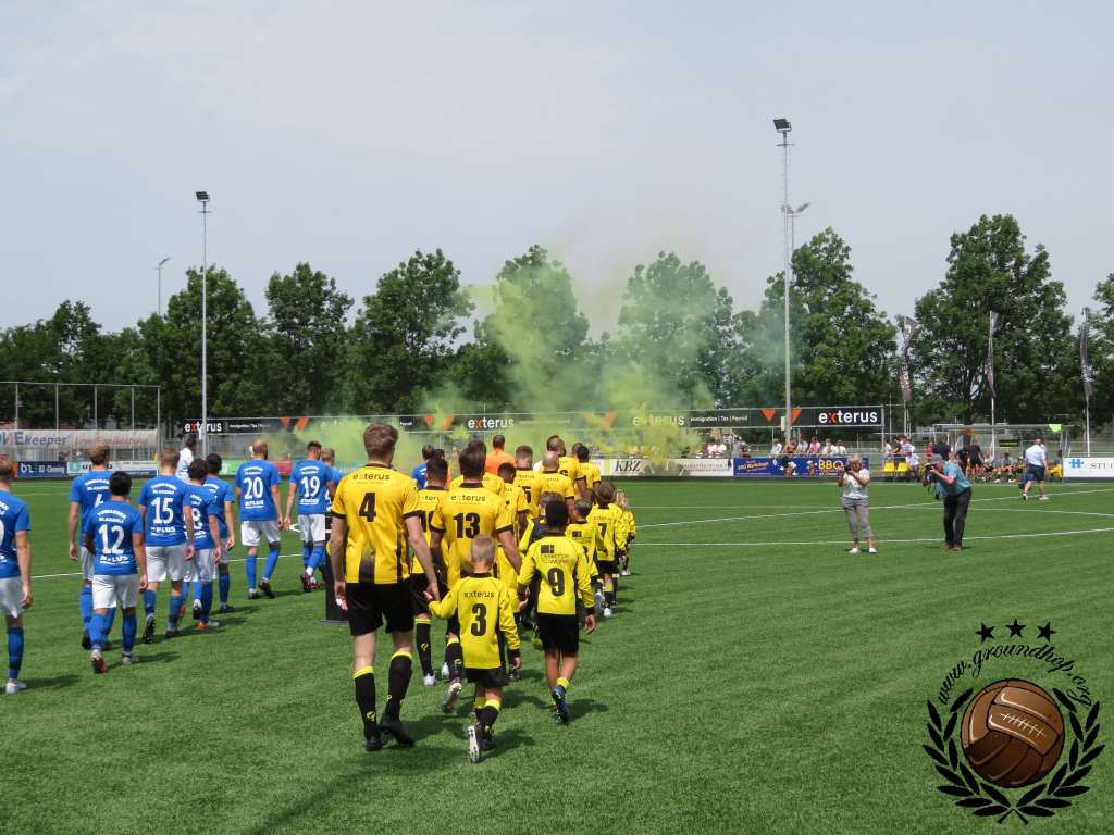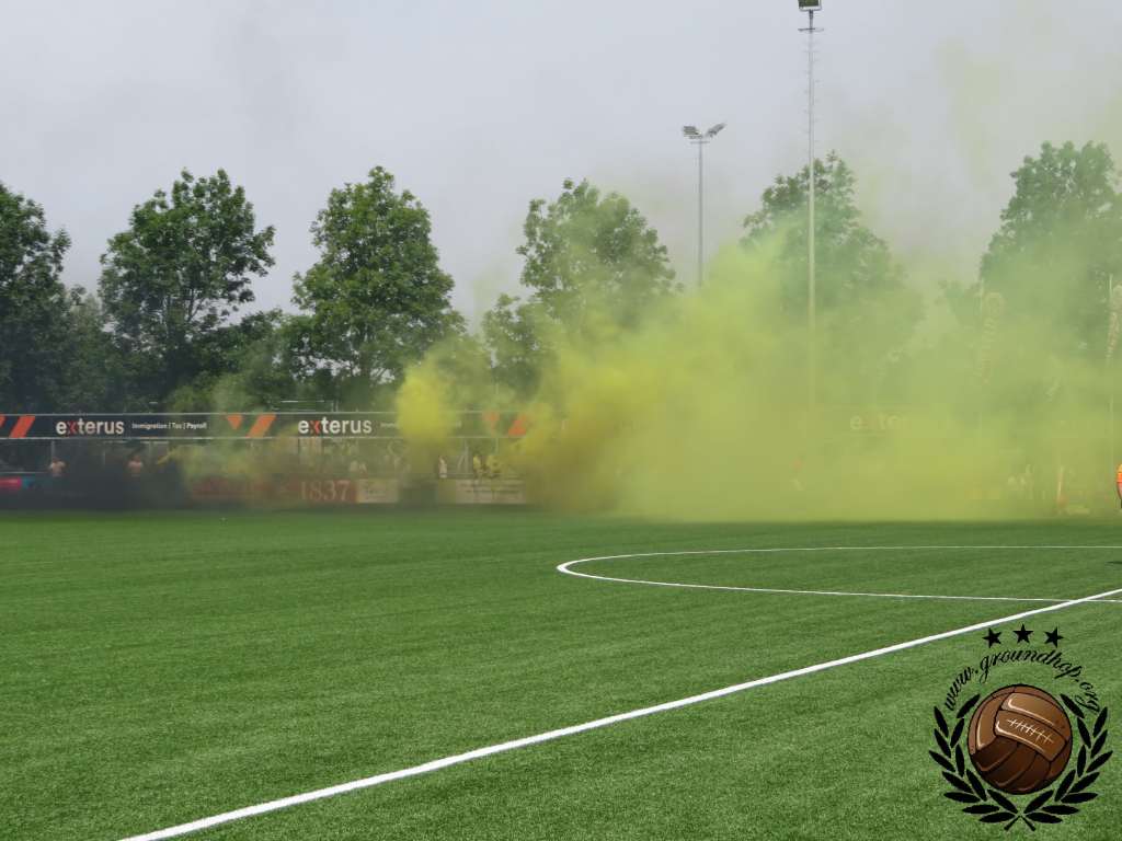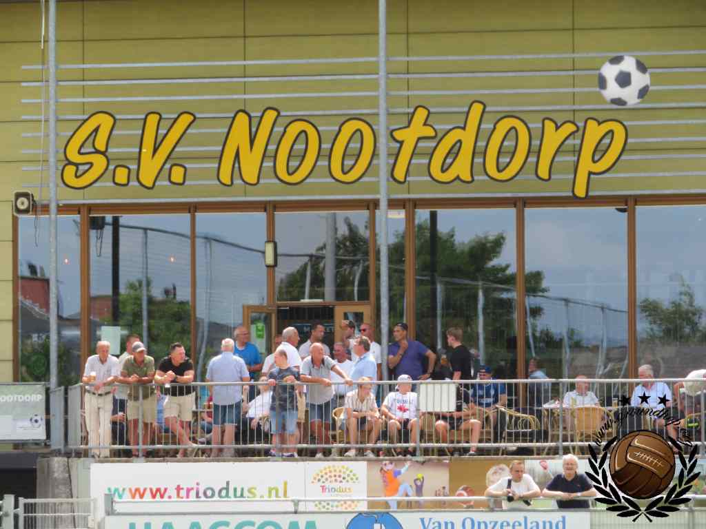In een zonovergoten Nootdorp, waar het kunstgrasveld als een soort straalkachel alle hitte weer laat opstijgen begint de wedstrijd (bijna traditiegetrouw in de nacompetitie) met een flinke portie pyro. Gele en zwarte rookpotten worden ontstoken en walmen over het broeierige sportpark.