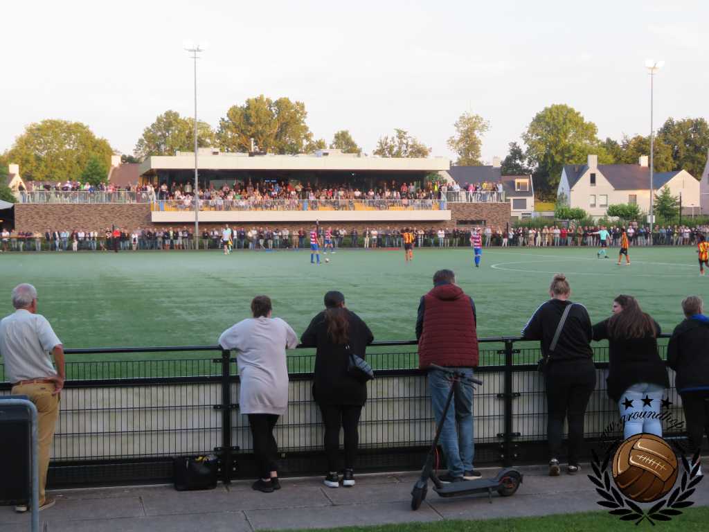 Het nadeel van wedstrijden op neutraal terrein merken we al voor het sportpark, aangezien parkeren een zeer lastige opgave blijkt te zijn. Iedereen is natuurlijk met de auto gekomen en het duurt dan ook niet lang voordat alle legale plekken zijn vergeven. Na een paar extra rondjes parkeren we maar in een wijk verderop omdat we anders waarschijnlijk een boete oplopen. Halverwege de wedstrijd roept de stadionspeaker ook om dat de foutparkeerders op last van de politie moeten verplaatsen dus onze keuze blijkt weer eens een uitstekende te zijn.