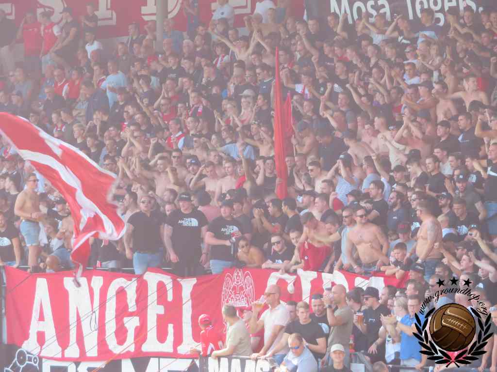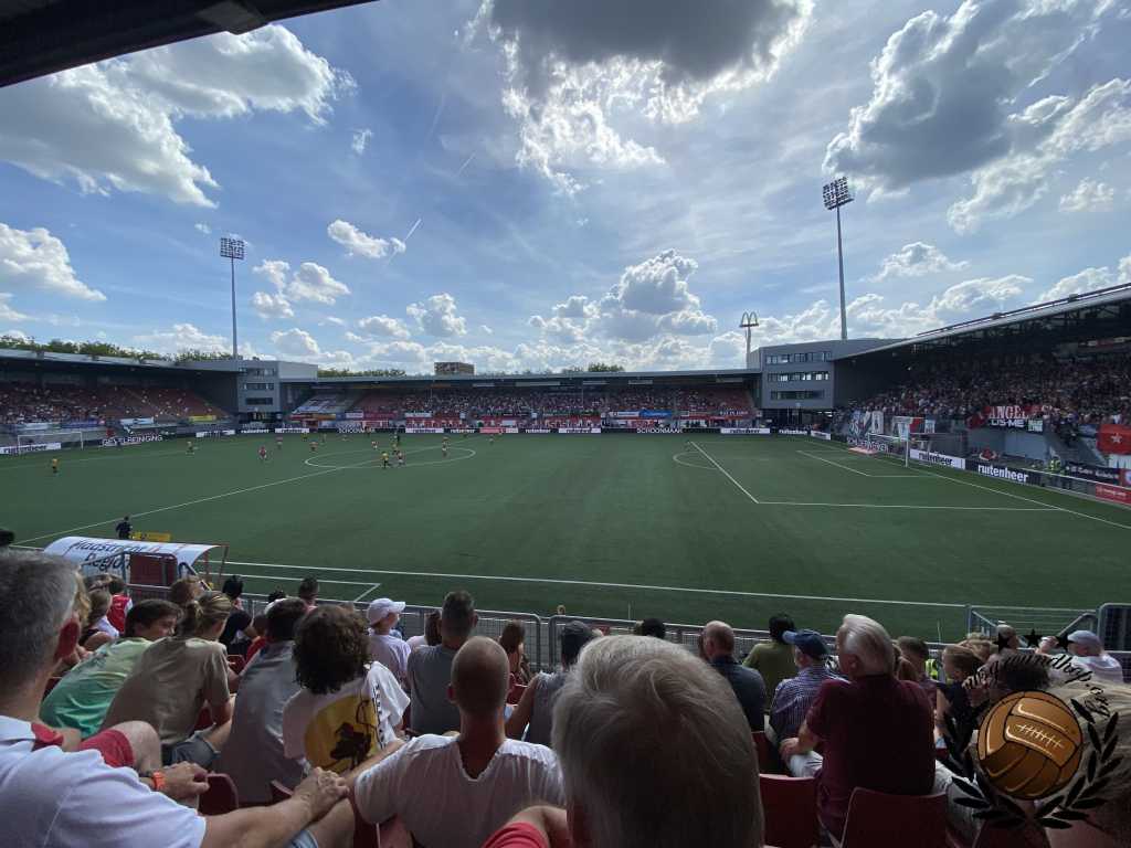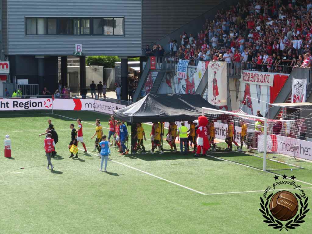 De eerste onderneming die wij doen is de auto goed positioneren om na deze wedstrijd meteen door te kunnen reizen naar Heerlen. Met een marge die eigenlijk te klein is, proberen we vandaag toch de combinatie te maken met Groene Ster. Eenmaal geparkeerd hebben we honger, dus duiken we de naastgelegen Mac in. Een beslissing die we achteraf beter niet hadden kunnen maken aangezien het één grote puinhoop was. Na ongeveer een uur hebben we dan toch ons eten en zijn genoodzaakt om dit in de rij voor het stadion op te eten omdat we anders de aftrap missen. Uiteindelijk betreden we vlak voor de aankomst van de Angel Side de tribune en ploffen we neer op een plaatsje in de zon.