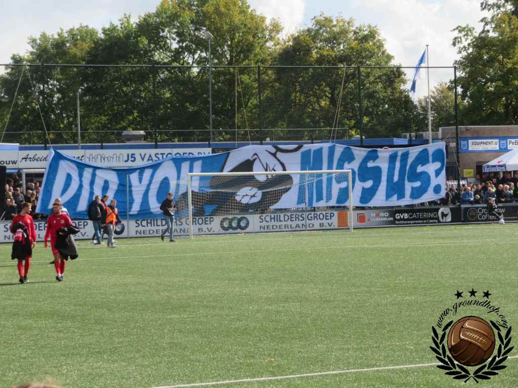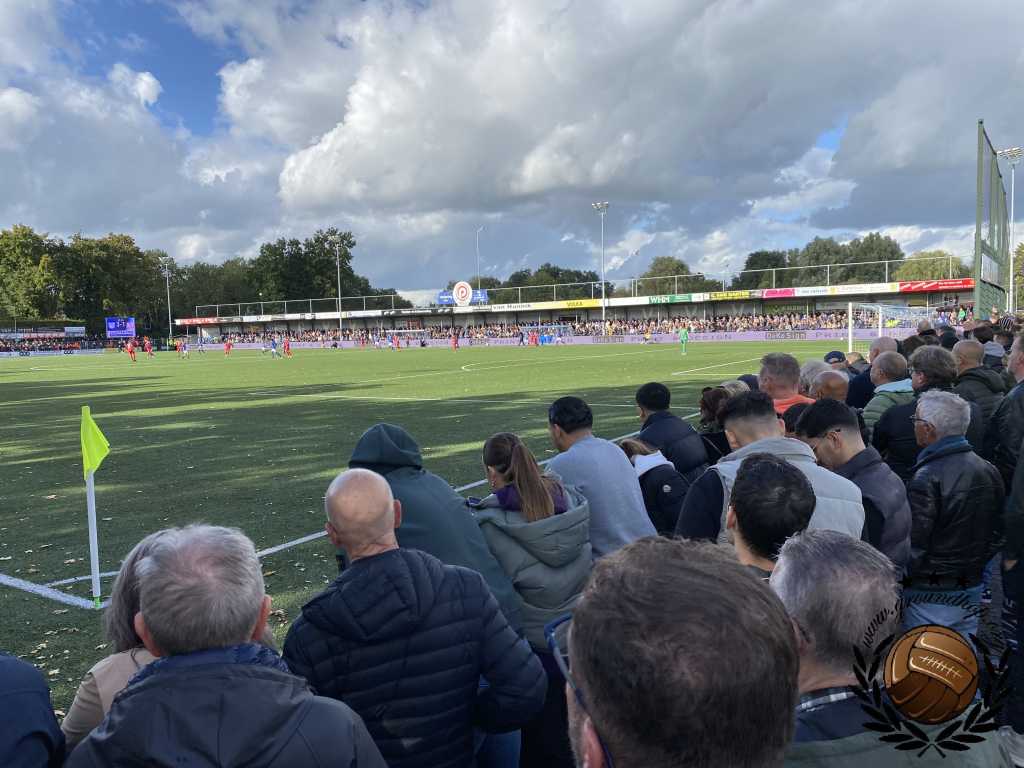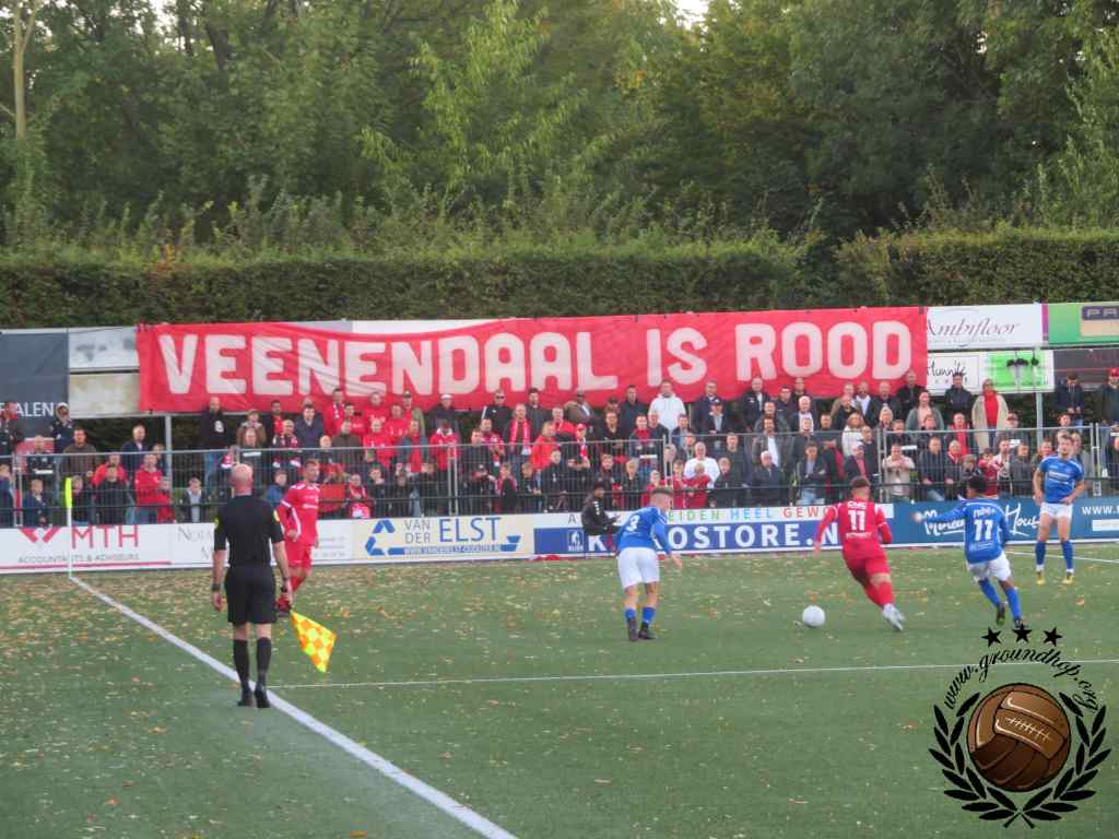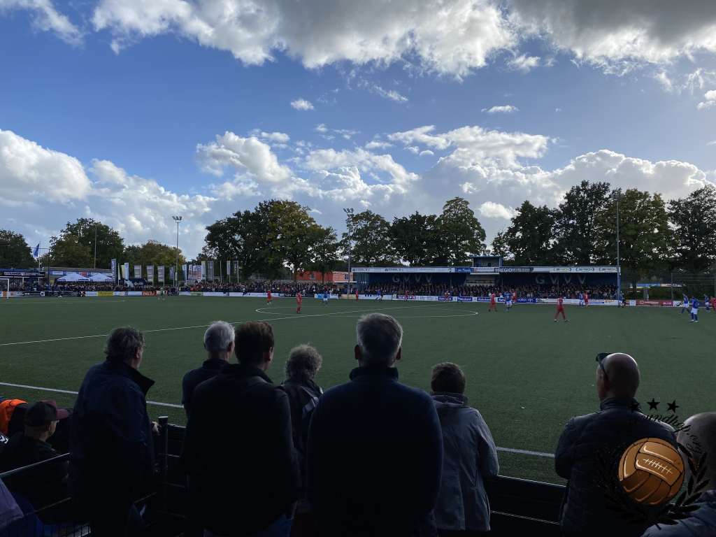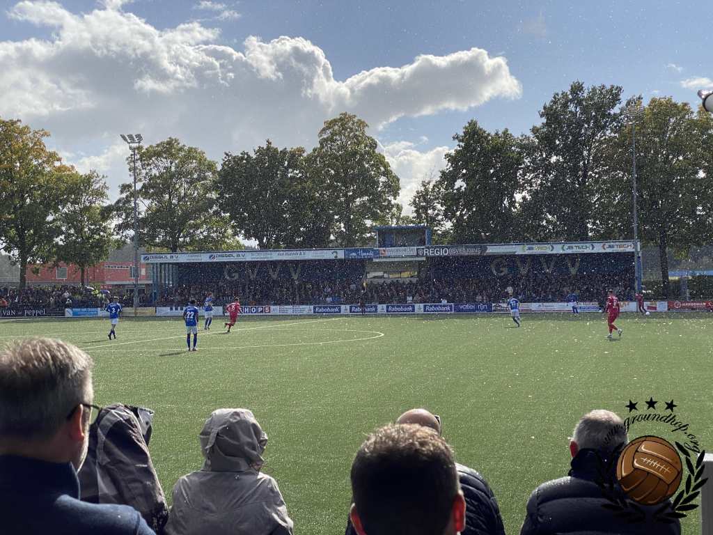 Vandaag is het dus tijd voor de derby van Veenendaal, welke vandaag voor het eerst sinds 2010 weer op het programma staat. Aangezien wij het levenslicht zagen in 2012, was dit een van die wedstrijden die voor ons al die tijd nog openstond. Een uurtje voor aanvang melden wij ons op het sportpark, waar een flinke rij voor de ingang staat. Echter is de rij ernaast een stuk kleiner en staan we een paar minuten later al binnen. Het terrein van GVVV staat al goed vol en zeker op de tribunes is het goed zoeken om een fijne plek te bemachtigen. Dat we op de tribune plaatsnemen blijkt een verstandige keuze, want de wedstrijd is nog geen kwartier oud en het komt met bakken uit de hemel.