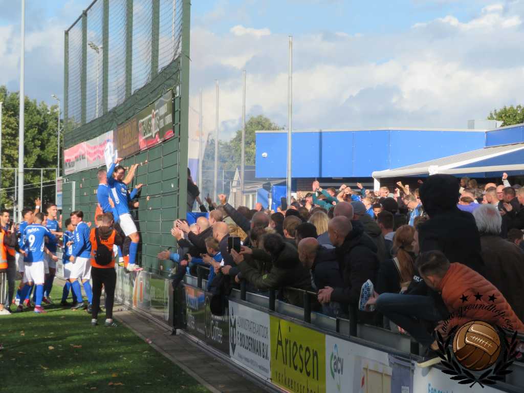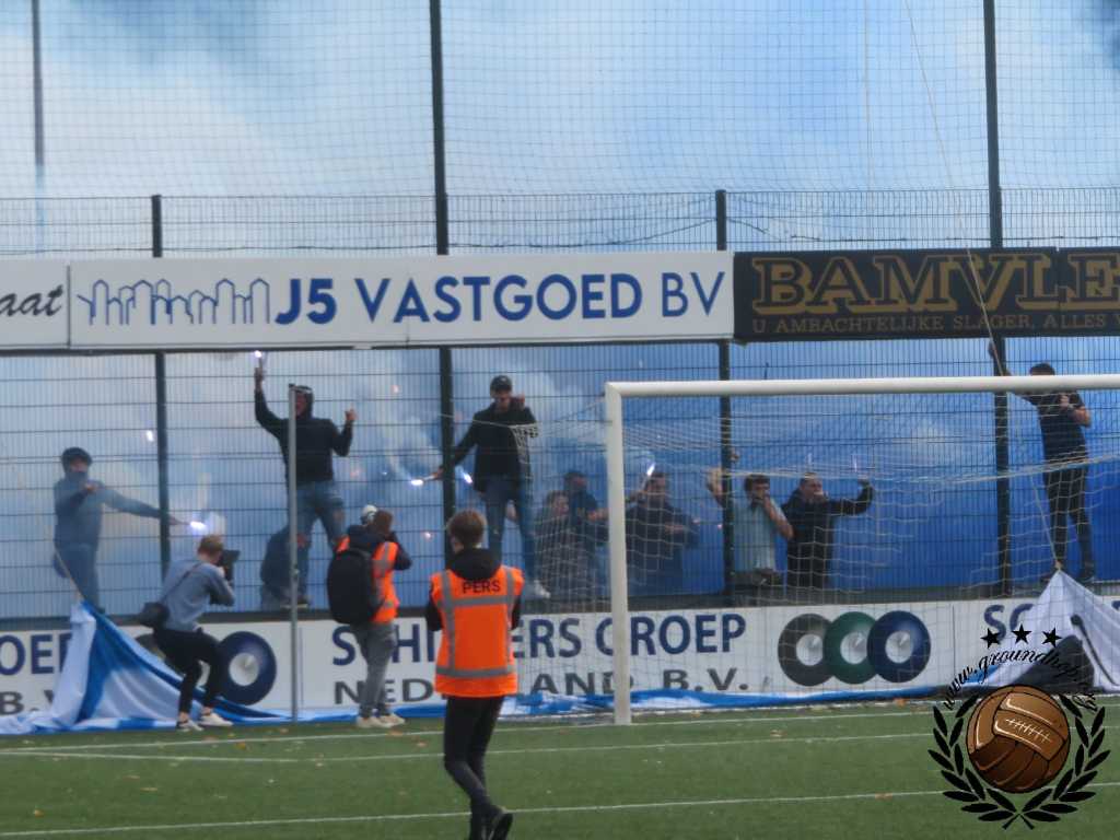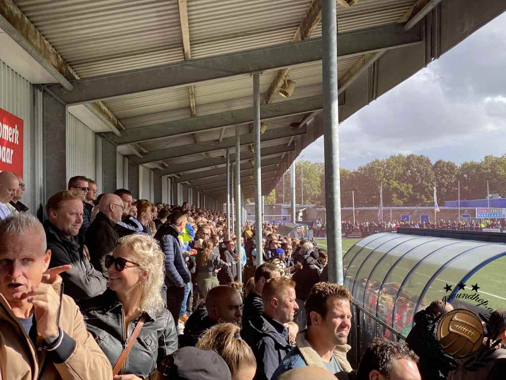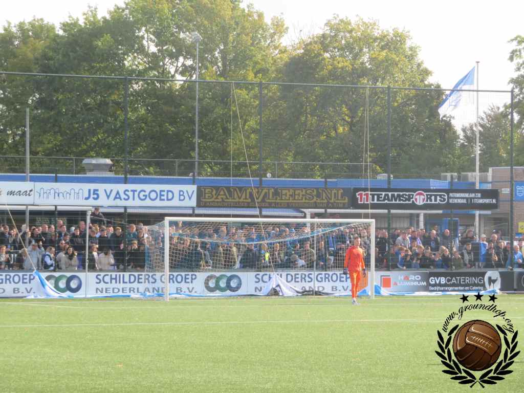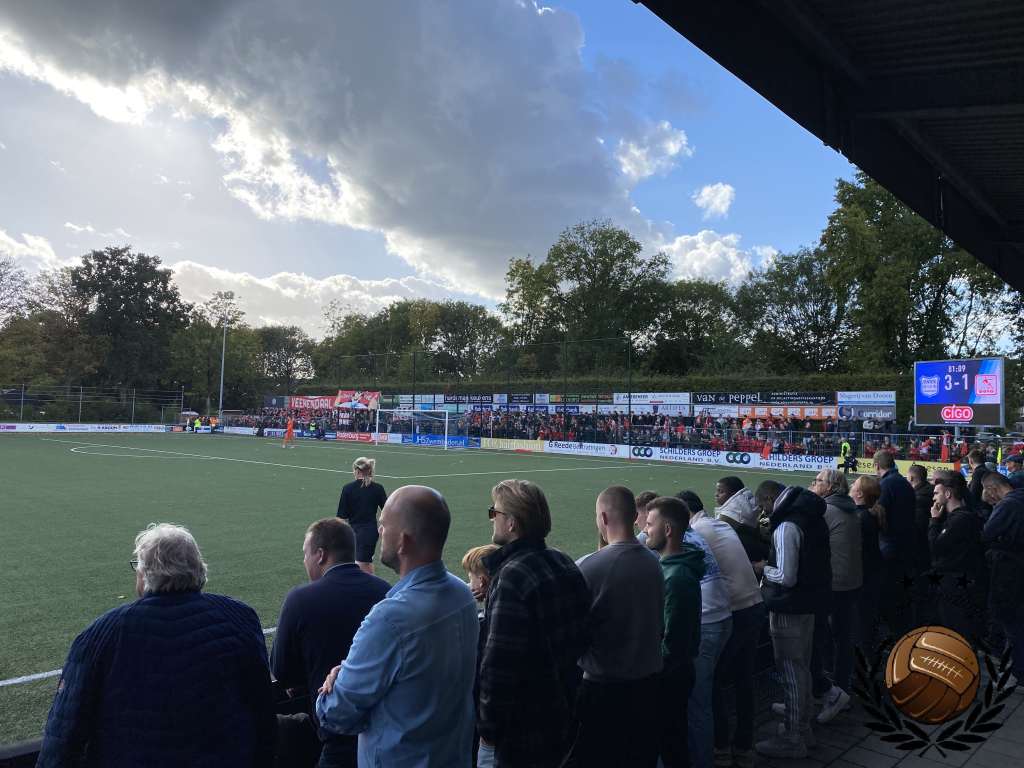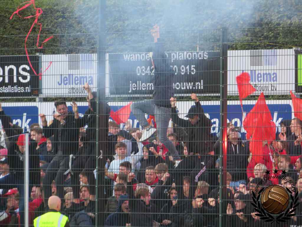 Vandaag is het dus tijd voor de derby van Veenendaal, welke vandaag voor het eerst sinds 2010 weer op het programma staat. Aangezien wij het levenslicht zagen in 2012, was dit een van die wedstrijden die voor ons al die tijd nog openstond. Een uurtje voor aanvang melden wij ons op het sportpark, waar een flinke rij voor de ingang staat. Echter is de rij ernaast een stuk kleiner en staan we een paar minuten later al binnen. Het terrein van GVVV staat al goed vol en zeker op de tribunes is het goed zoeken om een fijne plek te bemachtigen. Dat we op de tribune plaatsnemen blijkt een verstandige keuze, want de wedstrijd is nog geen kwartier oud en het komt met bakken uit de hemel.