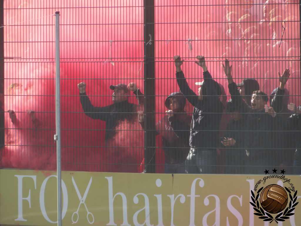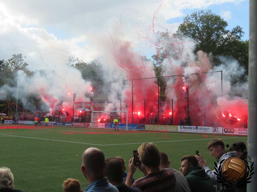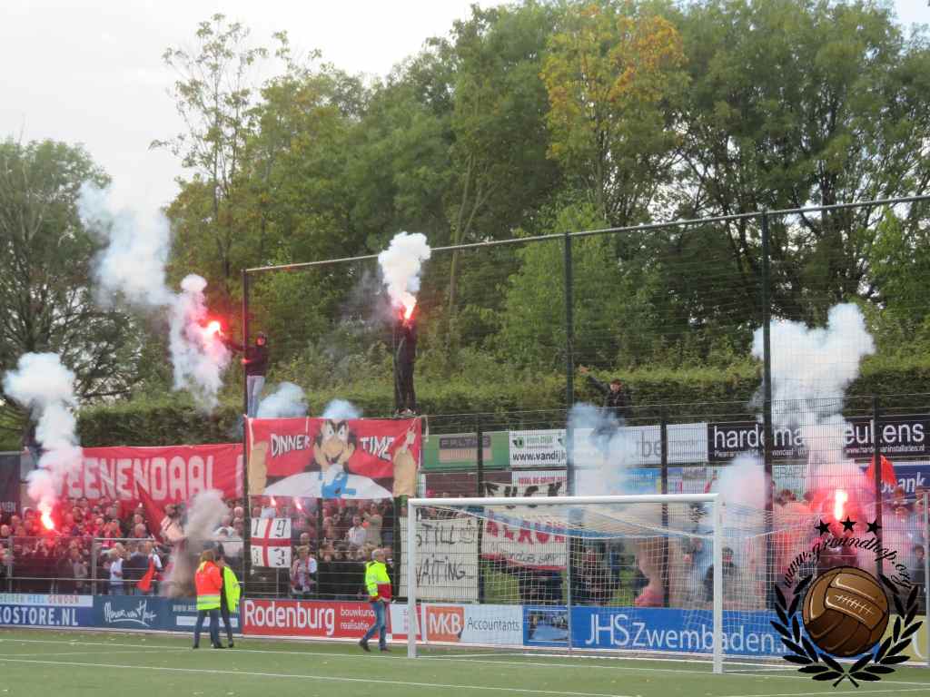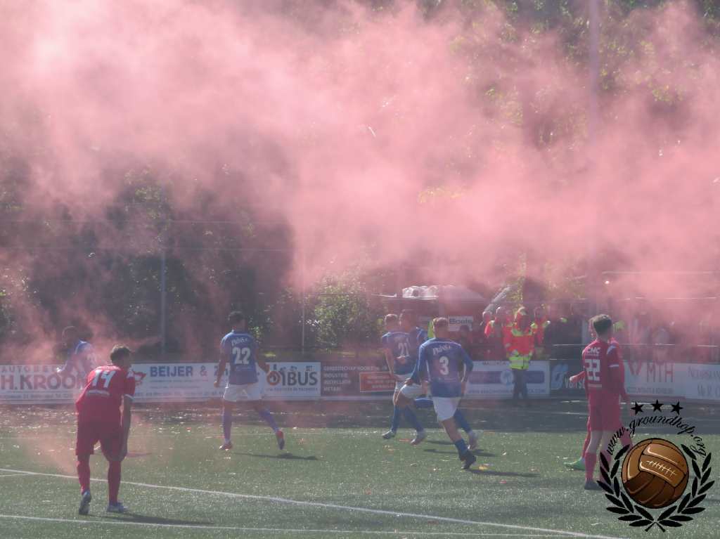 Voordat deze sluizen open zijn gezet, was het uiteraard tijd voor het nodige vuurwerk. Zowel GVVV als DOVO pakken uit met een flinke lading vuurwerk. Ondanks dat de pyro van GVVV begeleid werd met een spandoek, bevalt de actie van de Rooien ons toch beter. Naast dat het een beladen derby is, is het vandaag ook nog eens een wedstrijd tussen de nummers 1 en 2 van de Derde Divisie Zaterdag. Waar DOVO op basis van de stand de onderliggende partij zou moeten zijn, blijkt hier in de eerste helft niets van. De gasten zijn sterker en de kansen zijn ook, op een enkele uitzondering na, voor DOVO. Er is een klein half uur voor nodig, maar dan is het Guido van Dijk die raak weet te koppen en de gasten hiermee op voorsprong zet. De rookdampen na het vieren van het doelpunt zijn nog niet opgetrokken of er wordt alweer gelijk gemaakt. Direct vanaf de aftrap wordt Genrich Sillé naar voren gestuurd en schiet handig binnen.