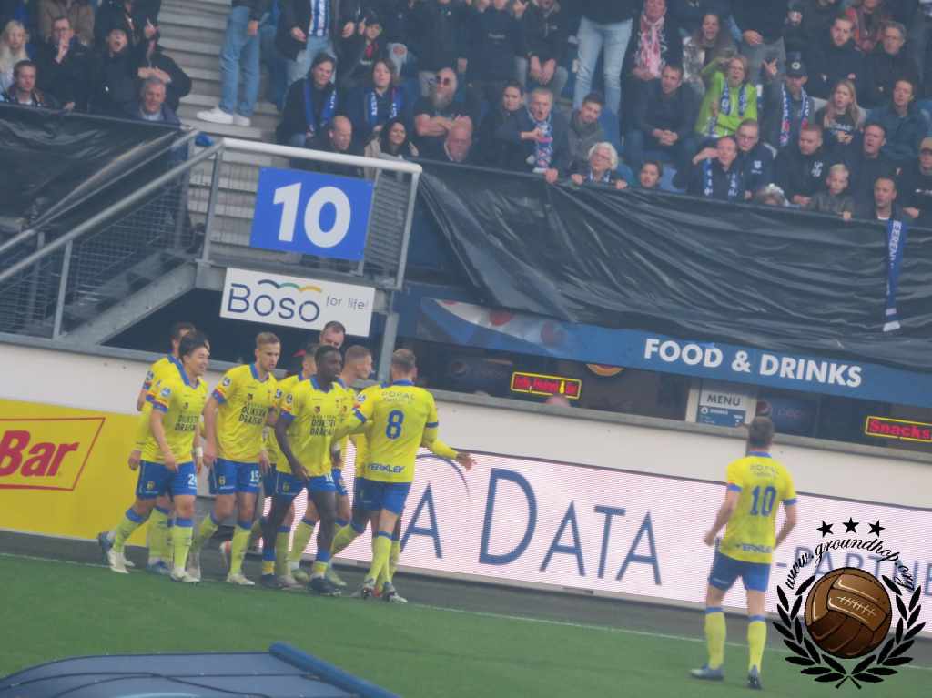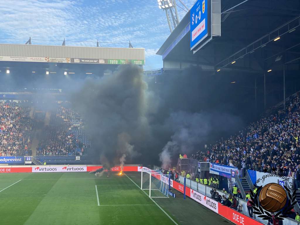 Opeens wordt er vanuit het uitvak een fors aantal rookpotten gegooid en deze eindigen zowel op het veld als op de naastgelegen thuisvakken. Scheidsrechter Lindhout legt de wedstrijd uiteraard stil, met de kanttekening dat dit meteen de laatste waarschuwing is voor vandaag en hij dreigt dus met een directe staking. Ook de stadionspeaker is nogal verbouwereerd en spreekt de gasten uit Leeuwarden teleurgesteld toe, al lijkt het ons dat de supporters uit Leeuwarden hier maling aan zullen hebben. Wel staat de wind verkeerd om de wedstrijdd langdurig stil te leggen en blijft de zwarte rook voornamelijk hangen in het vak waar het vandaan werd gegooid, dus het duurt niet al te lang voordat we weer kunnen voetballen. Het leek meer op een soort protestactie, maar de spelers van Cambuur hebben dit positief opgevat want direct na de hervatting komen ze op voorsprong. Na een uitgespeelde aanval mag Jamie Jacobs alleen op WK-ganger Andries Noppert af, omspeelt hem en tikt de bal in het lege doel.