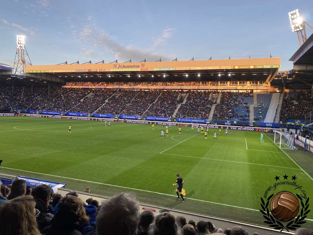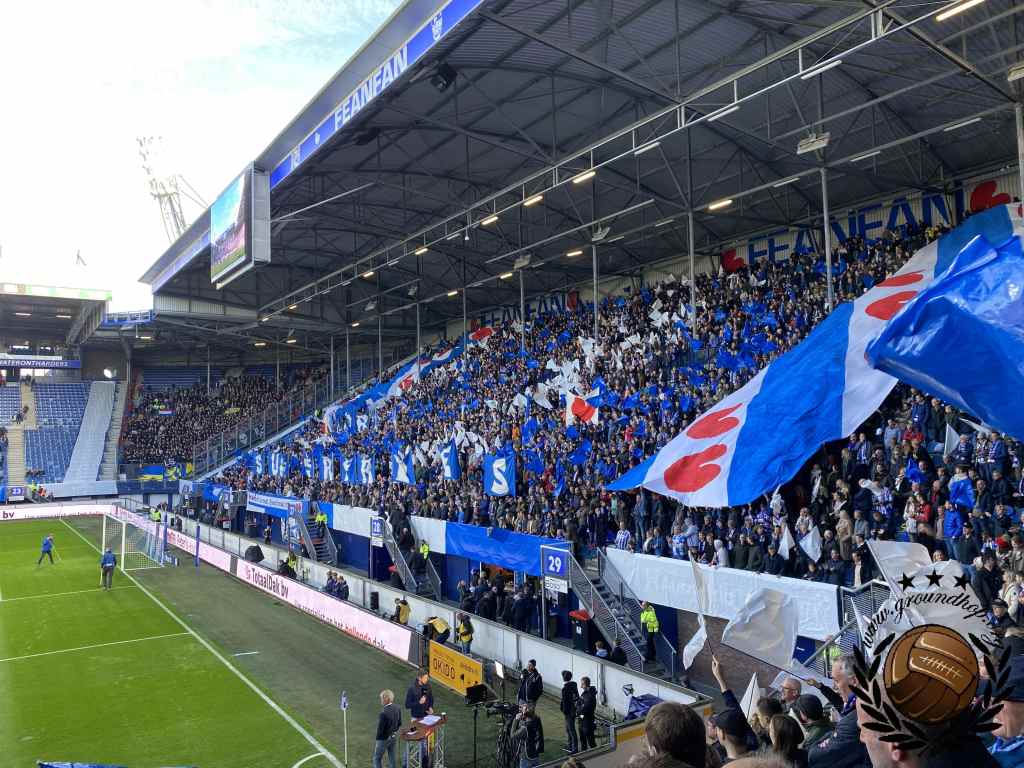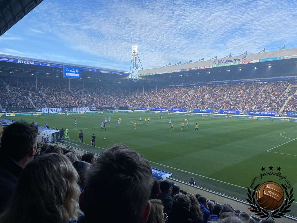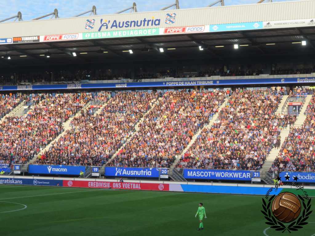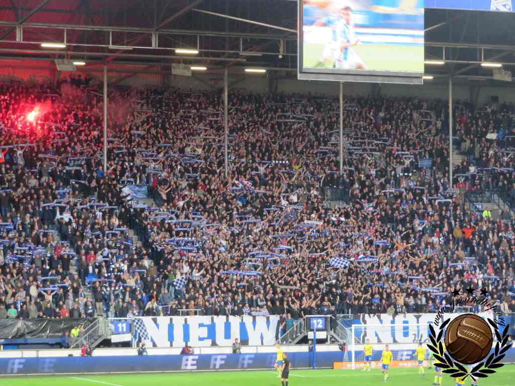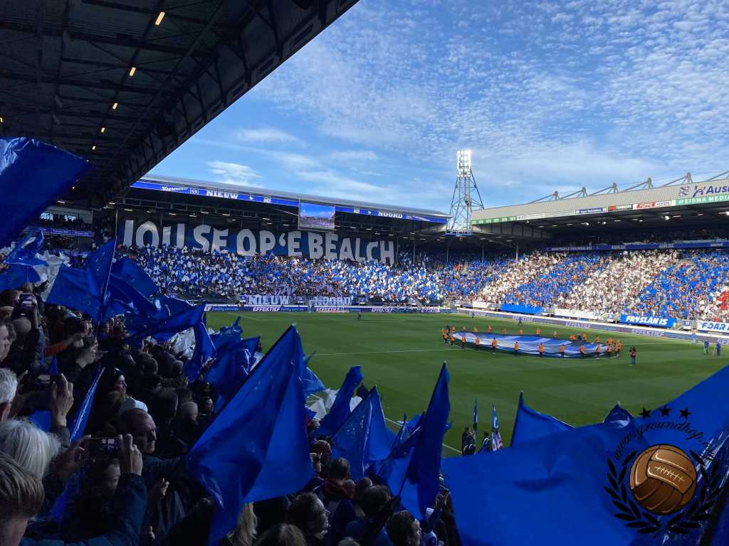 We zitten vandaag op de elitaire tribune, dus bij binnenkomst vinden ze het zelfs voor deze wedstrijd niet nodig om hier ook maar iemand te fouilleren. Ook de mensen die bij het scannen van hun kaart een kruis krijgen, mogen gewoon doorlopen en zo lijkt het allemaal maar vriendelijk te zijn hier in Heerenveen. Ongetwijfeld zal dit bij het uitvak en op Nieuw Noord er anders aan toe gaan, maar wij hadden hier vandaag een volledige pyro-actie mee naar binnen kunnen smokkelen. Gelukkig komen wij onder andere wel voor het vuurwerk, maar zijn we zodanig braaf dat wij ons hier zelf niet meer mee bemoeien.