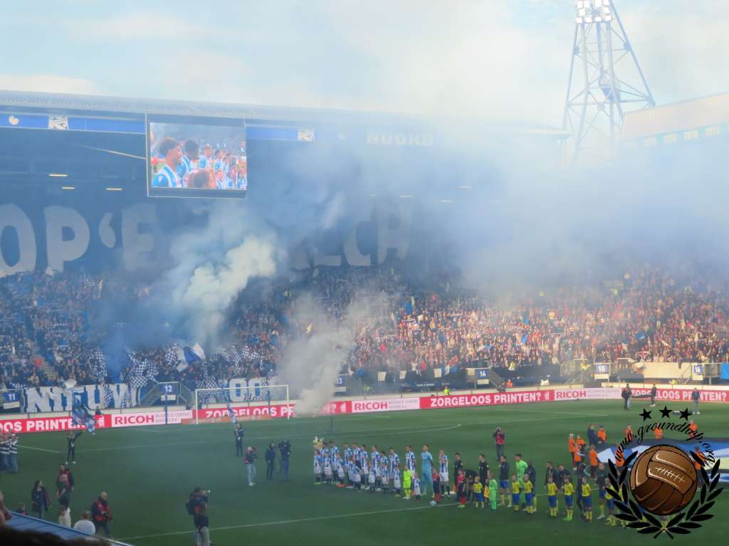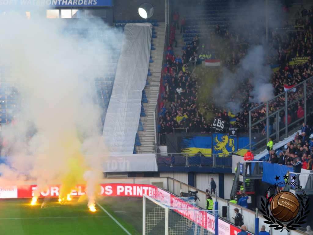 Met nog een kwartier tot de aftrap begint de thuisploeg alvast met zijn sfeeractie. Deze vroege timing zorgt er wel voor dat tegen de tijd dat er afgetrapt gaat worden de rookdampen alweer bijna zijn opgetrokken, maar ook bij de aftrap worden er nog wat rookpotjes tegenaan gegooid. Vanuit de kant van Cambuur blijft het verdacht rustig met slechts een paar rookpotjes, maar in de tiende minuut van de wedstrijd komen we erachter dat zij al het vuurwerk slechts bewaard hebben tot een later moment.