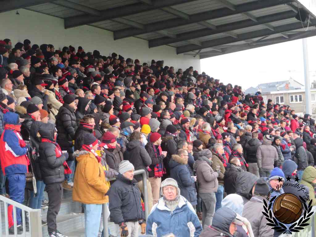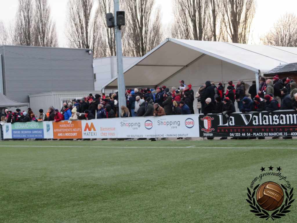 Ondanks dat de gevoelstempratuur ruim onder nul ligt, wordt er voor de tweede maal vandaag gevoetbald op kunstgras. Normaliter is dit natuurlijk 3x niks, maar vandaag is het best een uitkomst want anders had er geen wedstrijd te zien geweest hier. Voor wie er vandaag geen voetbal is, is voor de gasten uit La Louvière. Zij houden er een boycot op na wegens een aantal forse maatregelen. Naast dat er überhaupt maar 150 kaarten beschikbaar werden gesteld, moesten deze kaarten ook op naam gezet worden. Dit, samen met een dubbele paspoortcontrole en extra controle door de politie deed de supporters van La Lou besluiten om maar helemaal niet af te reizen naar Luik. Groot gelijk overigens.