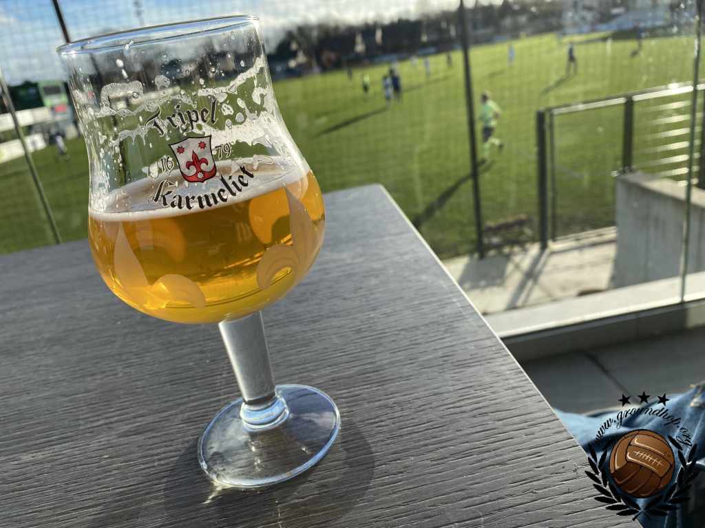 Precies op het eerste fluitsignaal arriveren we en we lopen linea recta richting het terras. In België zijn ze altijd goed met speciaalbier en deze reputatie wordt door Nijlen zeker niet geschonden aangezien we nog geen minuut later een Karmeliet van de tap hebben bemachtigd. Met een winterzonnetje op de knar zouden we nu van elke wedstrijd kunnen genieten, al wordt er op het veld een dappere poging gedaan om het tegendeel te bewijzen.