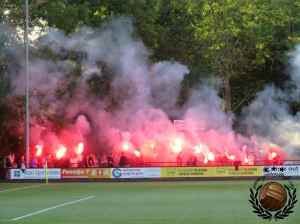 De maand juni staan over het algemeen in het teken van de play-offs en dat is dit jaar zeker niet anders. Eerst zien we in Den Haag HVV met 1-0 winnen van KDO en drie dagen later is het de beurt aan HSC uit Haaksbergen en GVVV. Deze wedstrijd is een prooi voor de gasten uit Veenendaal, die met een 1-3 zege van het veld stappen en het karwei thuis mogen afmaken. Dit doen ze dan ook en een week later zien wij ze alweer spelen, ditmaal bij Kozakken Boys. De Werkendammers zijn in een wedstrijd met heel veel vuurwerk en schermutselingen tussen de supporters met 3-1 te sterk. De terugwedstrijd willen we ook bezoeken maar deze wordt ons vakkundig voor de neus geboord door de KNVB. Op de dag van deze wedstrijd moeten wij last-minute uitwijken naar plan B, welke in ons geval een bezoek aan Veen bevat. Hier wordt de finale van de Play-Offs voor de Hoofdklasse Zaterdag afgewerkt. De spelers van SDV Barneveld en SV Nootdorp maken er een potje van in een van de mindere wedstrijden die wij dit jaar zien. Naast het veld is het zoals gewoonlijk in de play-offs weer dik in orde, met ontzettend veel vuurwerk. De stadionspeaker moet er meermaals aan te pas komen en uiteindelijk loopt het na een provocerend doek van Barneveld richting Nootdorp nog ontzettend uit de hand. Er wordt een goed aantal rake klappen uitgedeeld en het blijft nog lang onrustig naast en op het veld.