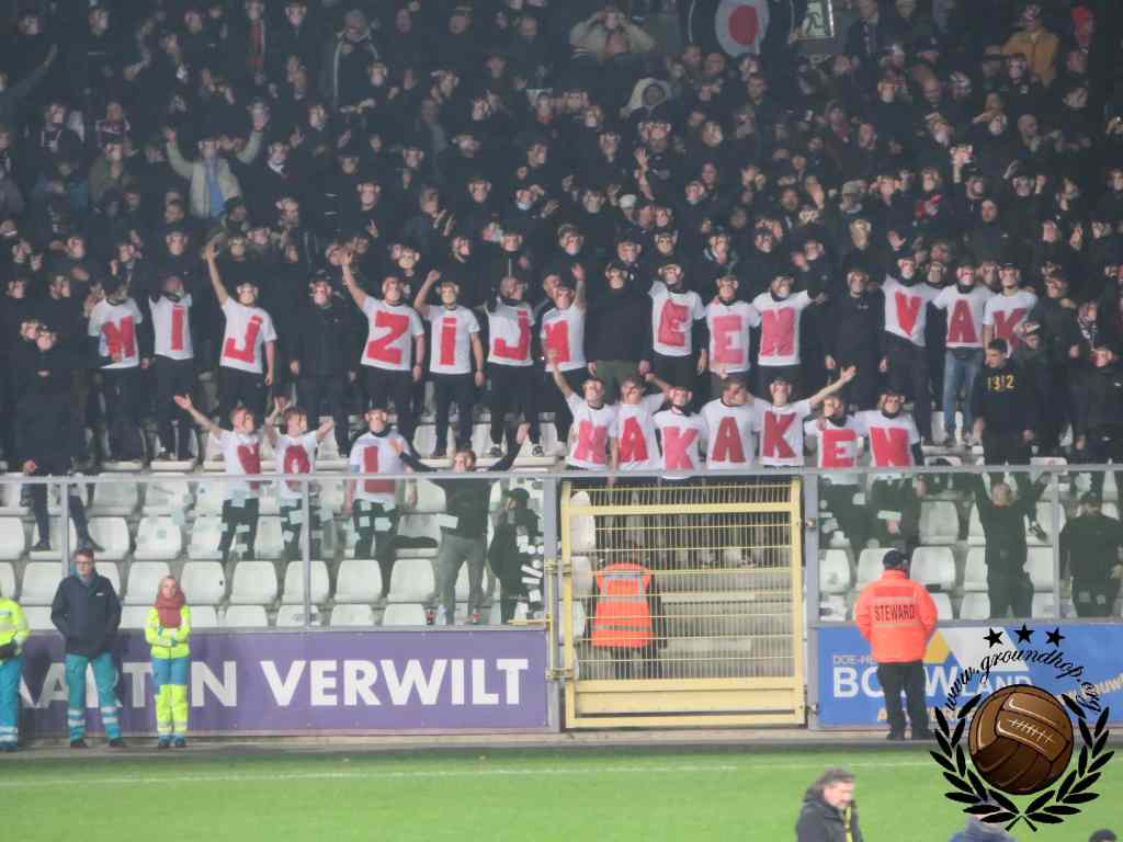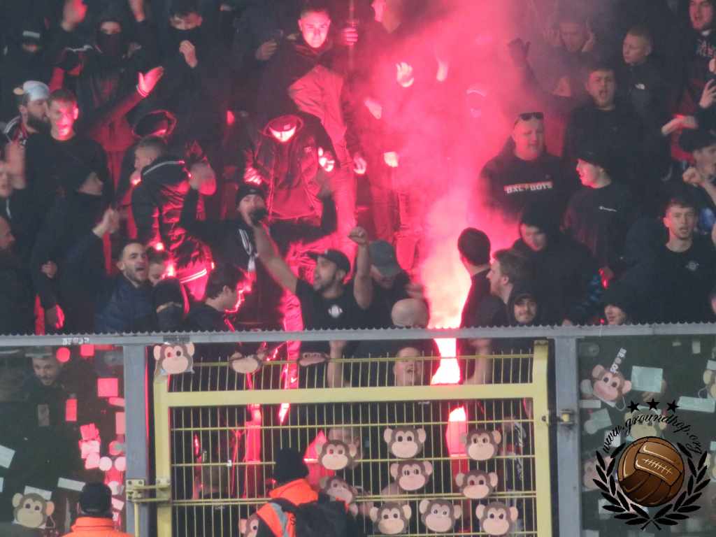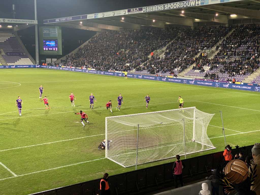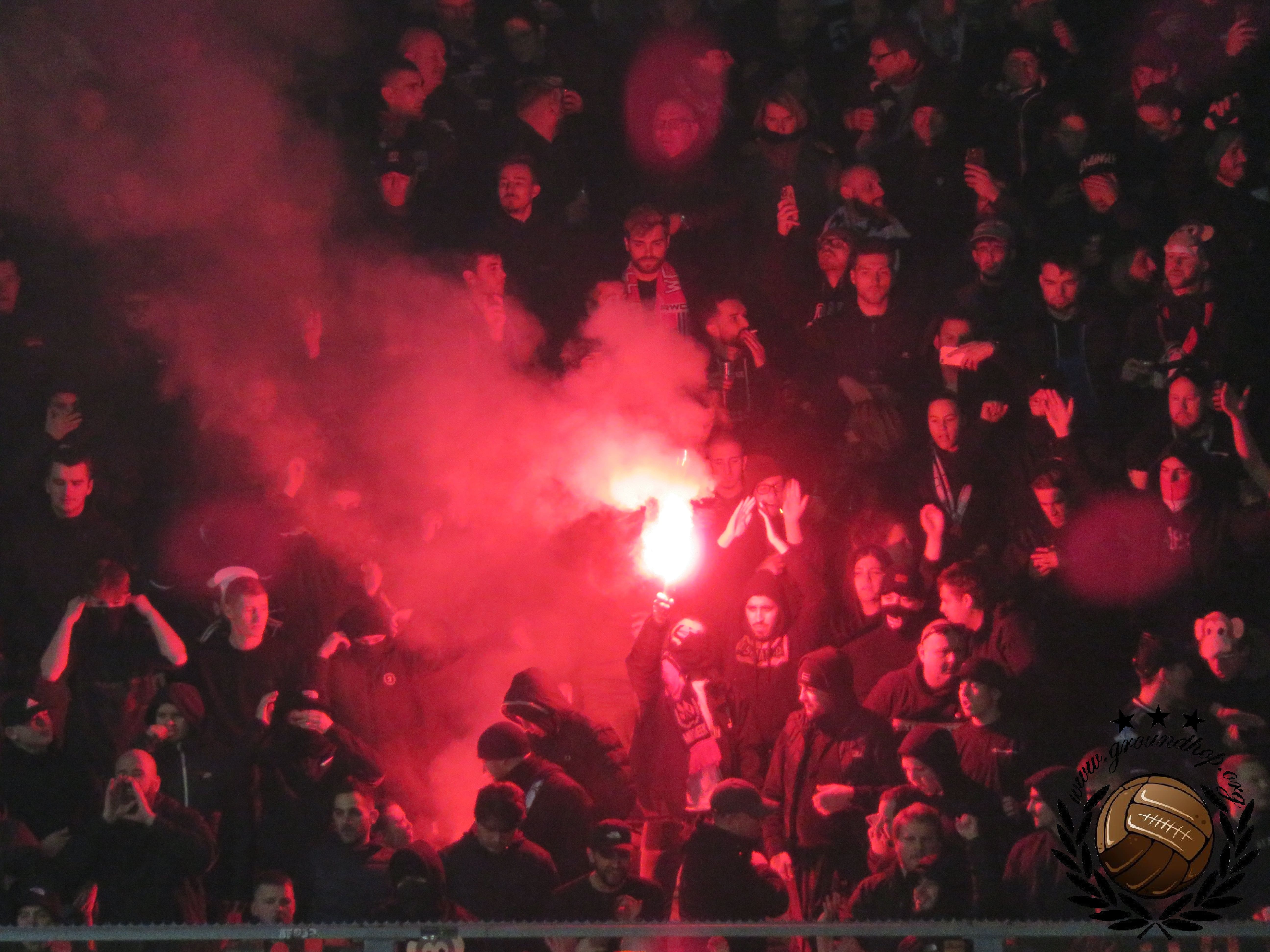 De wedstrijd zelf is zowel op het veld als op de tribune een leuke om te aanschouwen. Op de tribune moeten de Ratten echt wel gas geven om de gasten uit Brussel te overstemmen. Op het veld is Beerschot de bovenliggende partij, al zijn de grootste kansen voor de gasten. Doelpunten levert het uiteindelijk niet op, maar ondanks de 0-0 stand kunnen we terugkijken op een leuke eerste helft. Wel begint op de tribune het gevoel al te heersen dat er vandaag niet gewonnen zal worden door Beerschot, maar dat ligt voornamelijk aan de scheidsrechter die volgens de meeste aanwezigen voor RWDM is. Bij het achteraf bestuderen van de beelden snappen we het gevoel enigszins.