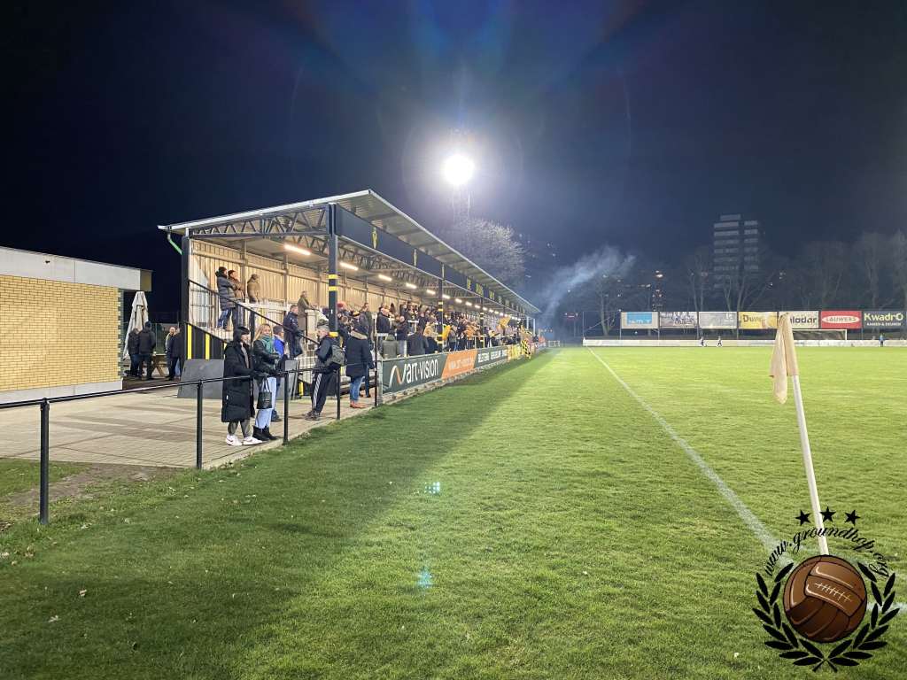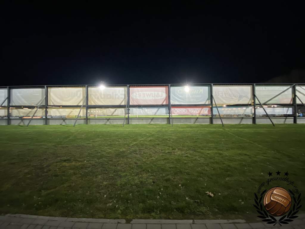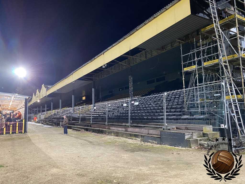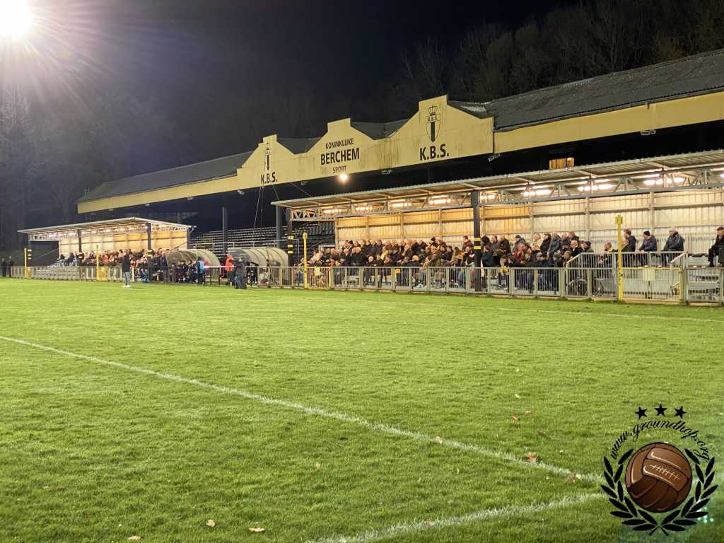 Dat het stadion inmiddels bijna volledig is afgebroken is natuurlijk een doodzonde, want het was een iconisch stadion. Dat het allang niet meer vol zat en dat het van ellende uit elkaar viel dat snappen we allemaal wel, maar het komt de ambiance niet ten goede. Op de sintelbaan zijn nu wat kant en klare tribunes van ijzer uit de grond gestampt en zo is er weer een prachtig stadion de vernieling in geholpen. De oude hoofdtribune staat nog, maar is volledig afgesloten. We nemen plaats op de staantribune waar vandaag alle sfeer vandaan zal komen. Zowel het uitvak, als de sfeergroep van Berchem staat op onze tribune en af en toe is het verdacht lastig om te traceren welke groep er nou precies kabaal maakt.