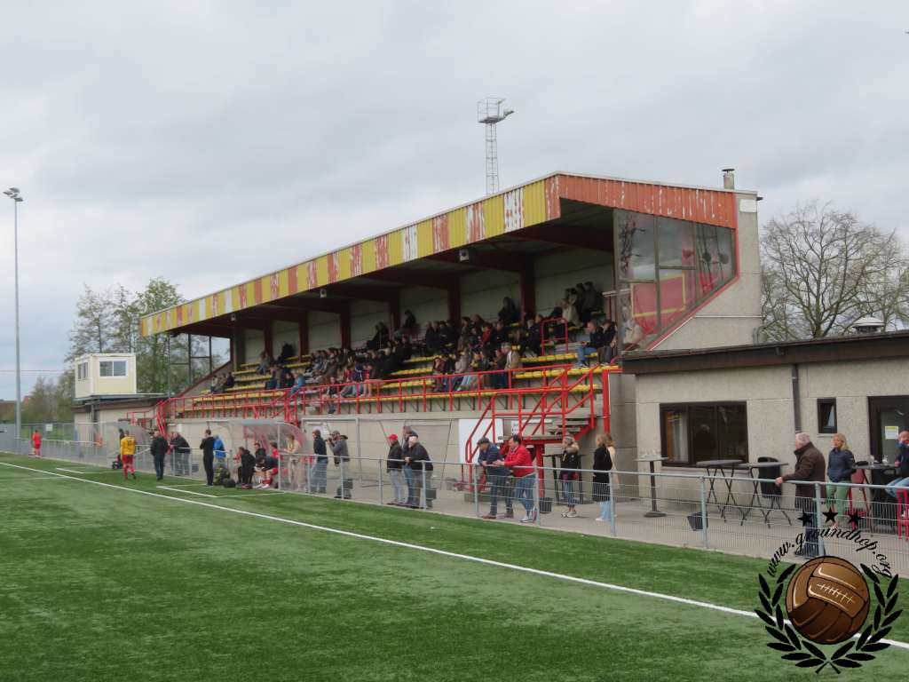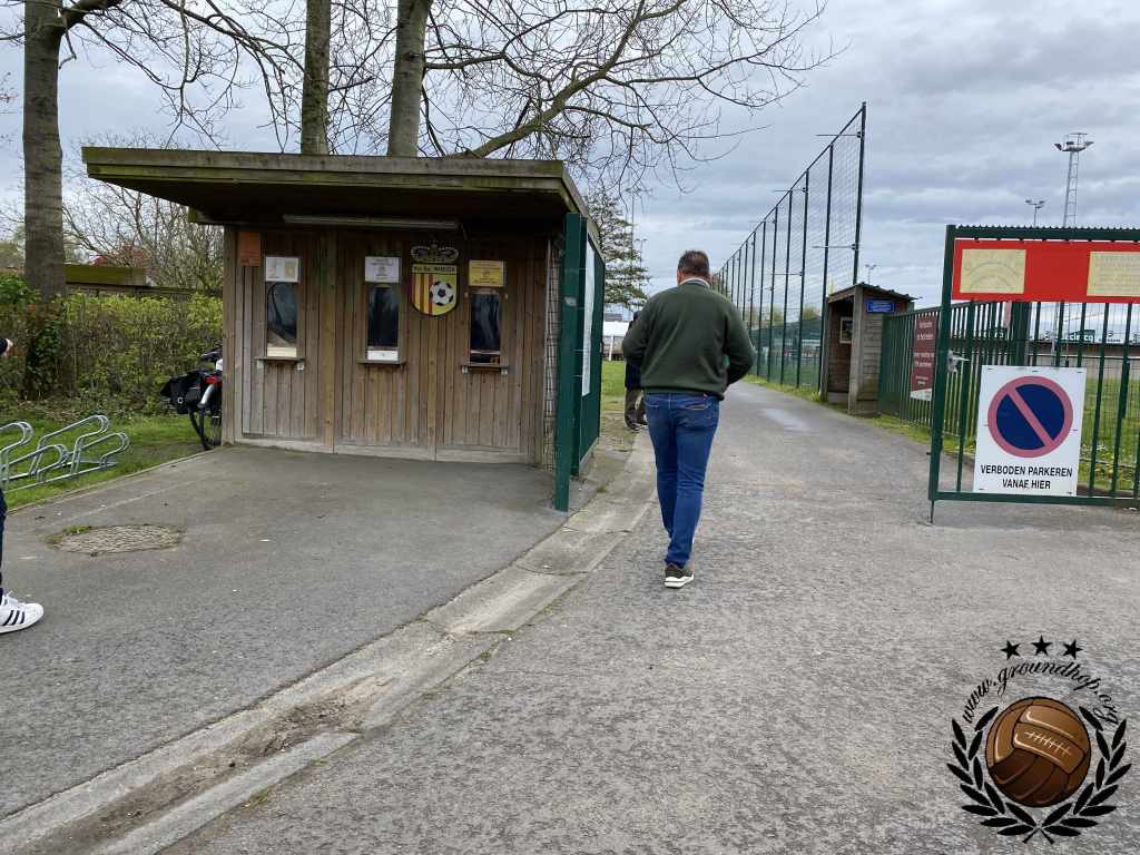 Er werd een zonnig weekend voorspelt, maar we komen aan in de regen. Er hangt een flink wolkendek boven Waregem en we komen niet droog in de kantine aan. Tot onze grote schrik zijn ze ook hier overgestapt op jetons, welke dan weer contant aangeschaft moeten worden. Na heel veel moeite hebben we dan toch een biertje bemachtigd, welke dan wel weer met glas en al mee de tribune op mag.